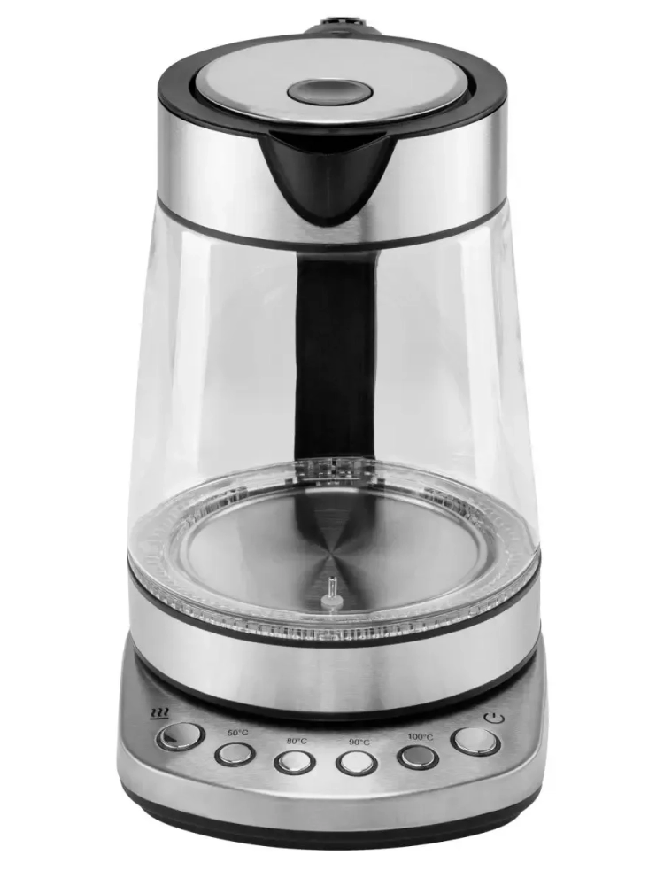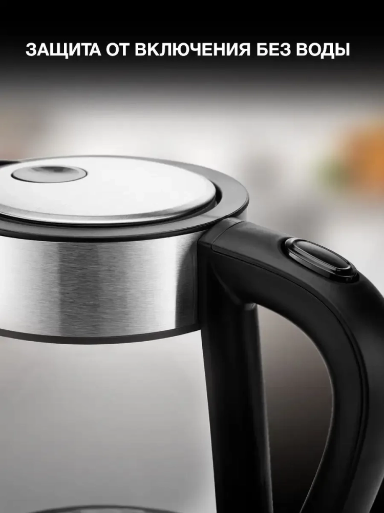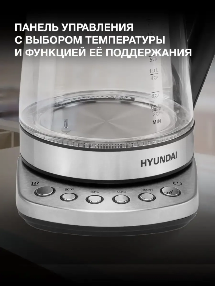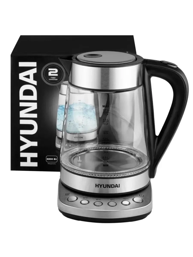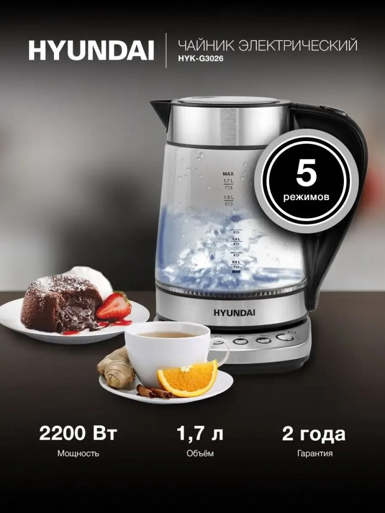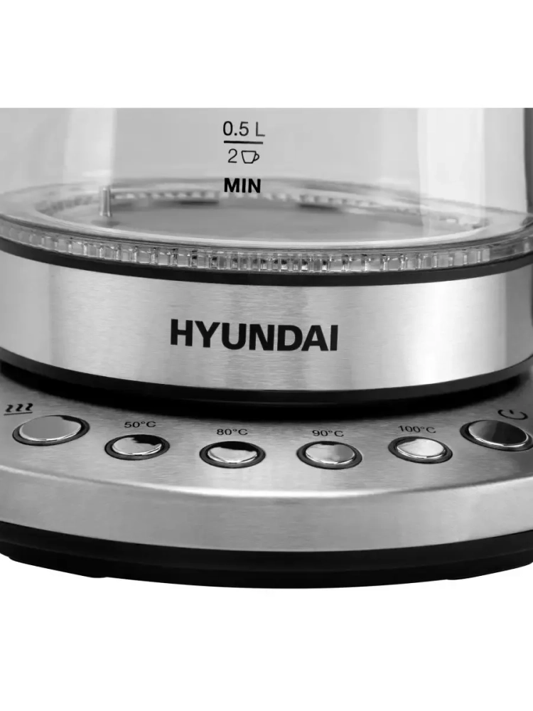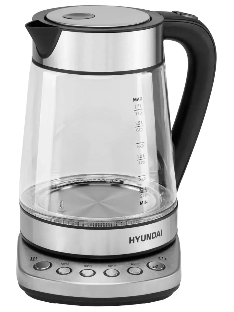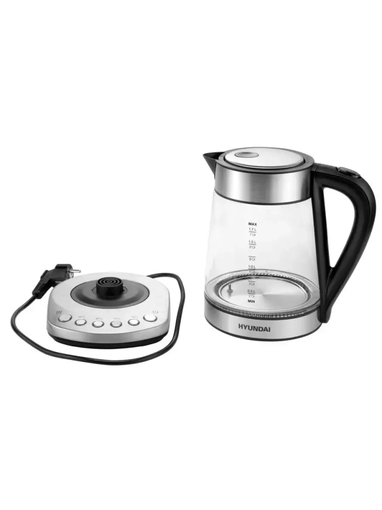 Чайник электрический Hyundai HYK-G3026 серебристый/черный, объём 1.7л, мощность 2200Вт, материал корпуса: стекло.