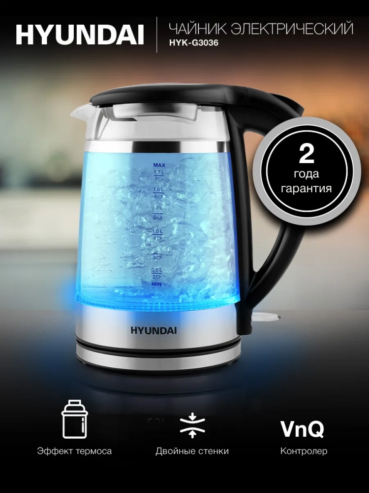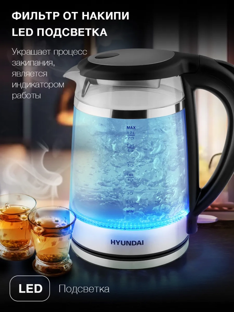 Hyundai HYK-G3036 оснащен скрытым нагревательным элементом, для быстрого и равномерного нагрева. Индикатор уровня воды позволяет контролировать количество заливаемой жидкости, а фильтр от накипи обеспечивает чистоту и превосходный вкус каждого напитка.