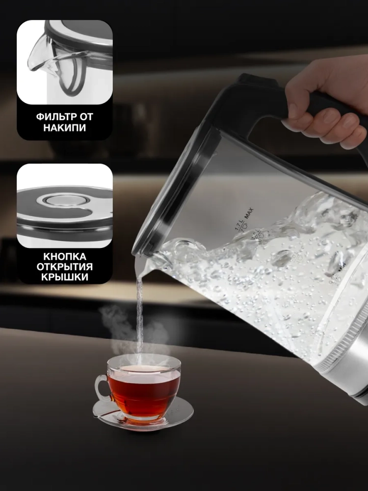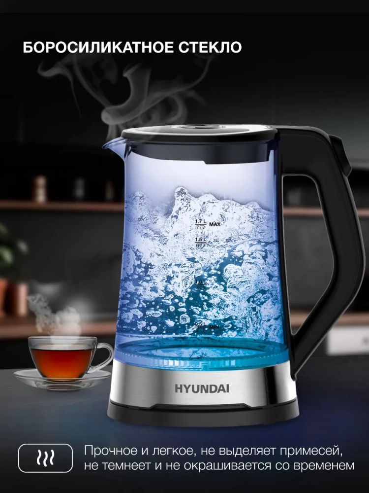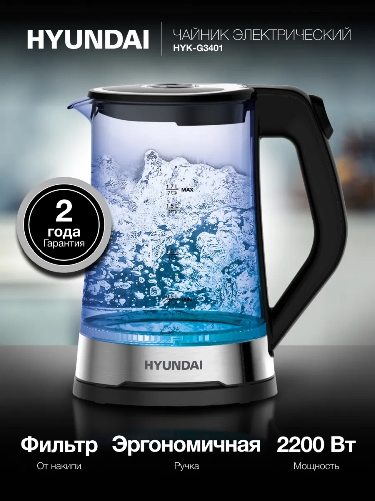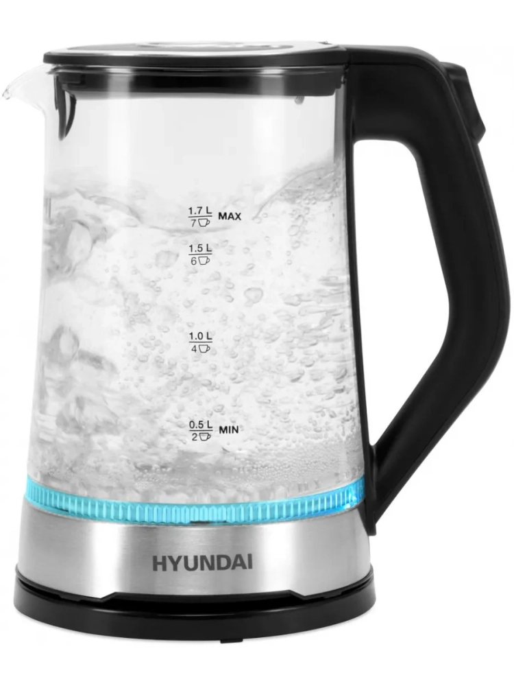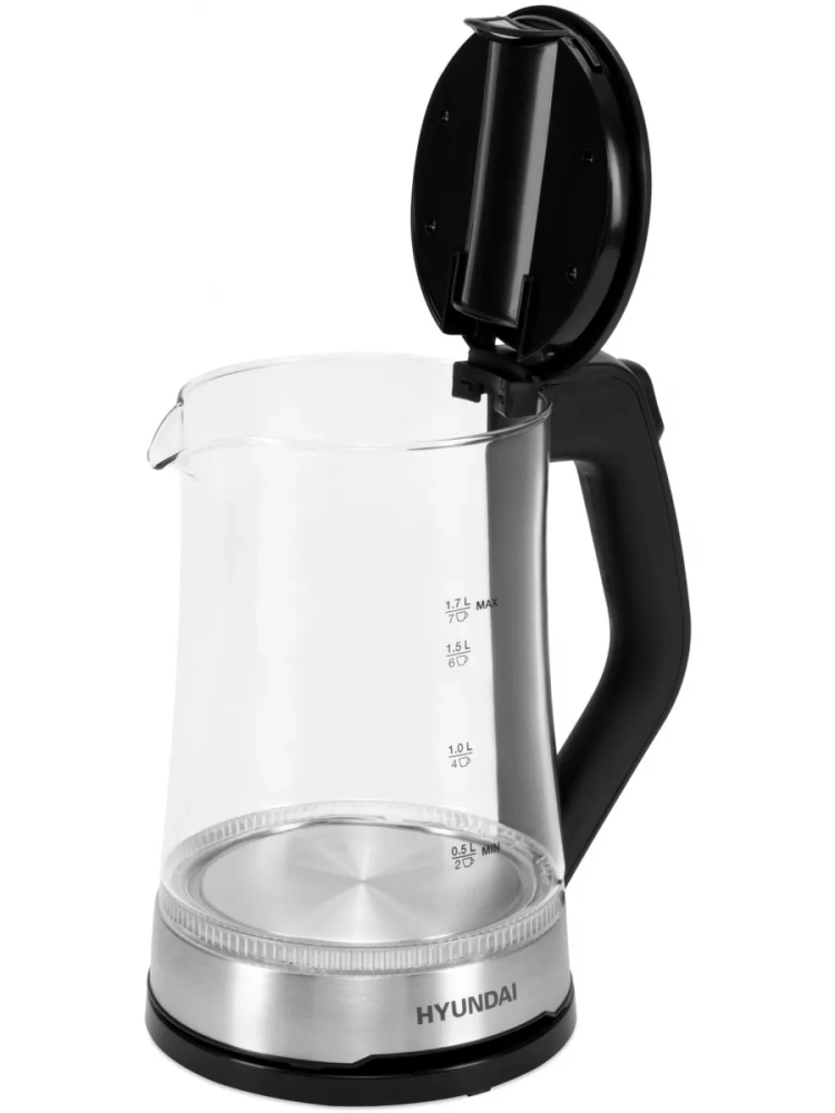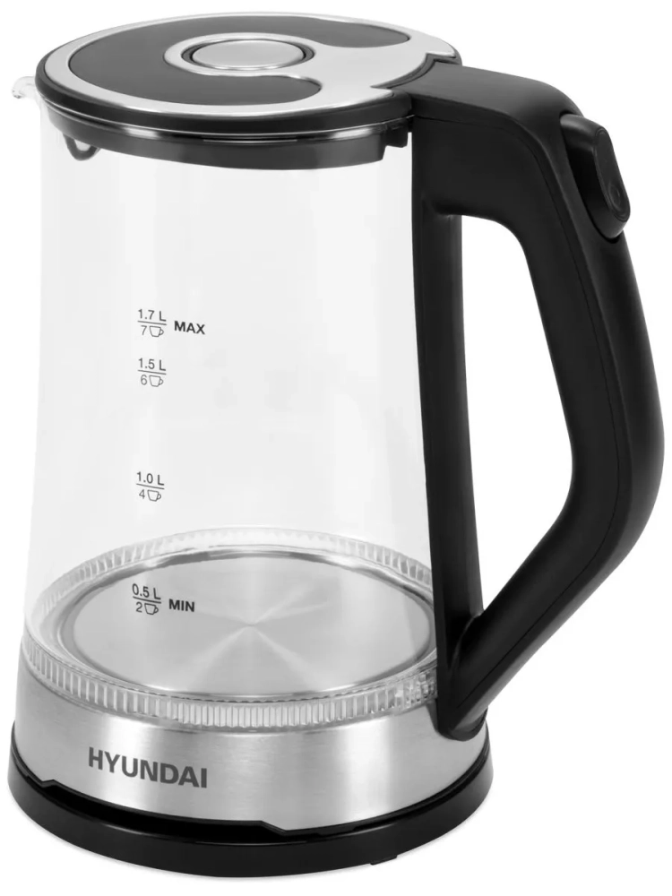 Чайник электрический Hyundai HYK-G3401 черный/серебристый, объём 1.7л, мощность 2200Вт, материал корпуса: стекло/пластик.
