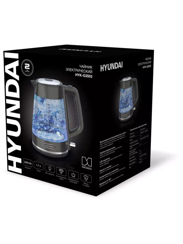 Чайник электрический Hyundai HYK-G3503 черный/серебристый, объём 1.7л, мощность 2200Вт, материал корпуса: стекло/пластик.