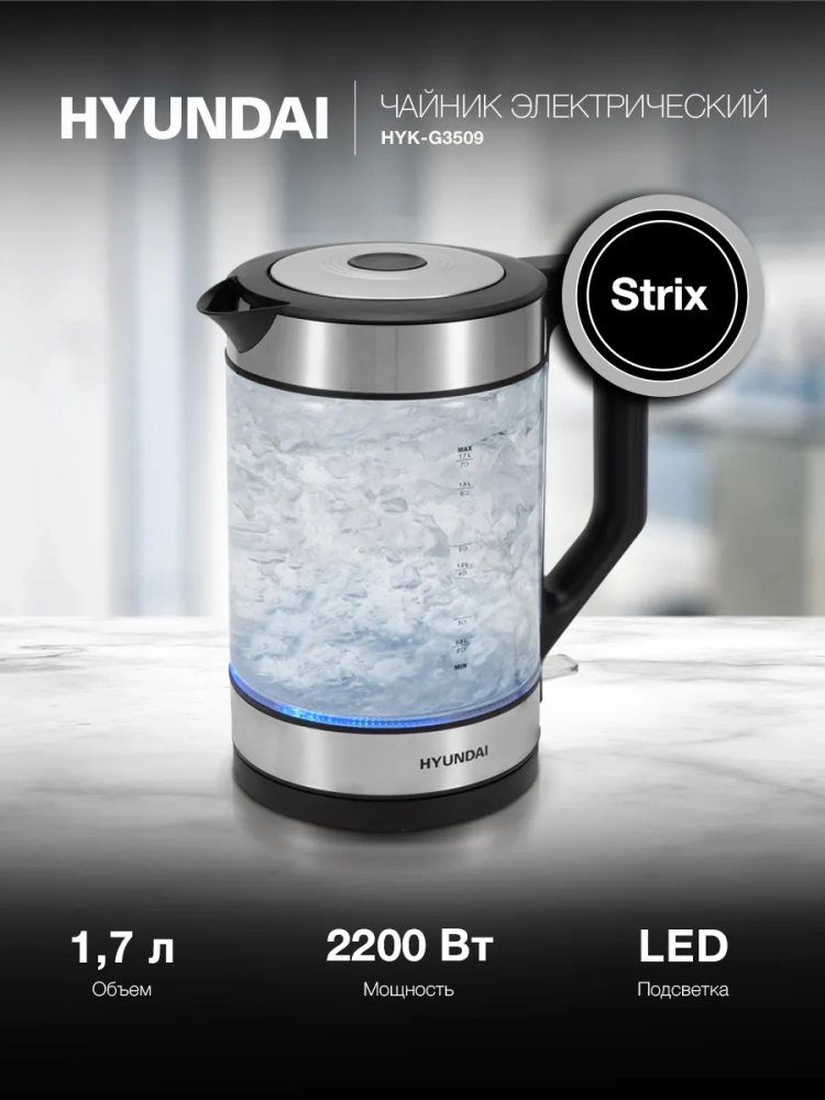 Электрический чайник Hyundai HYK-G3509 в элегантном сочетании черного матового пластика и прозрачного закаленного стекла – современный прибор, который станет не только надежным помощником на Вашей кухне, но и стильным акцентом в интерьере. Мощность в 2200 Вт гарантирует быстрый нагрев воды, а вместительный объем в 1.7 литра позволяет приготовить достаточно горячих напитков для всей семьи или компании друзей.