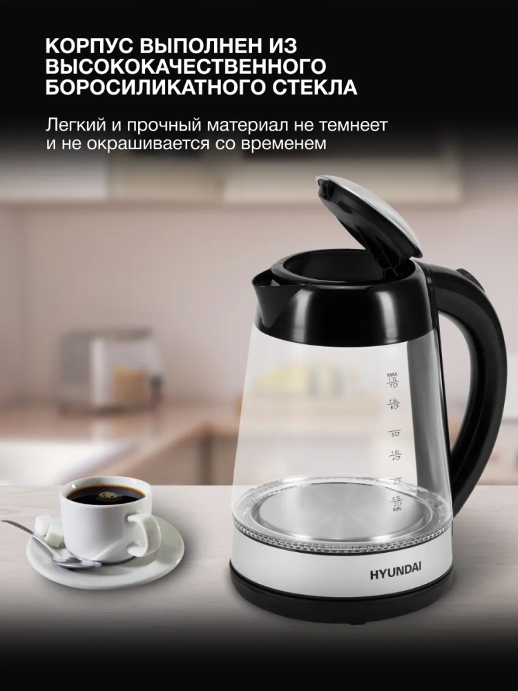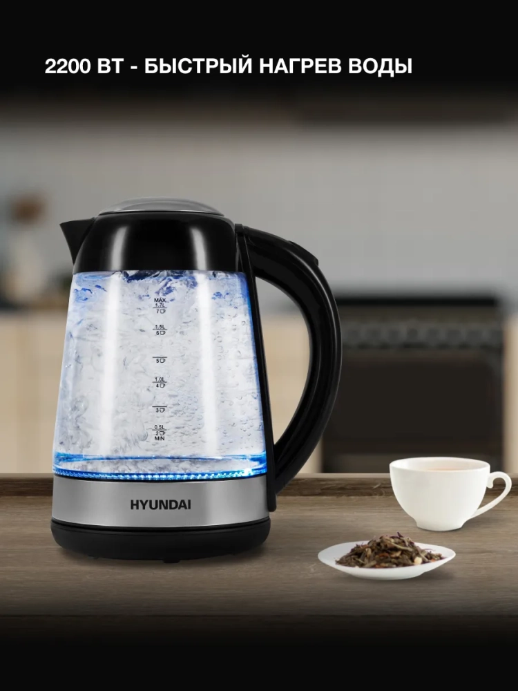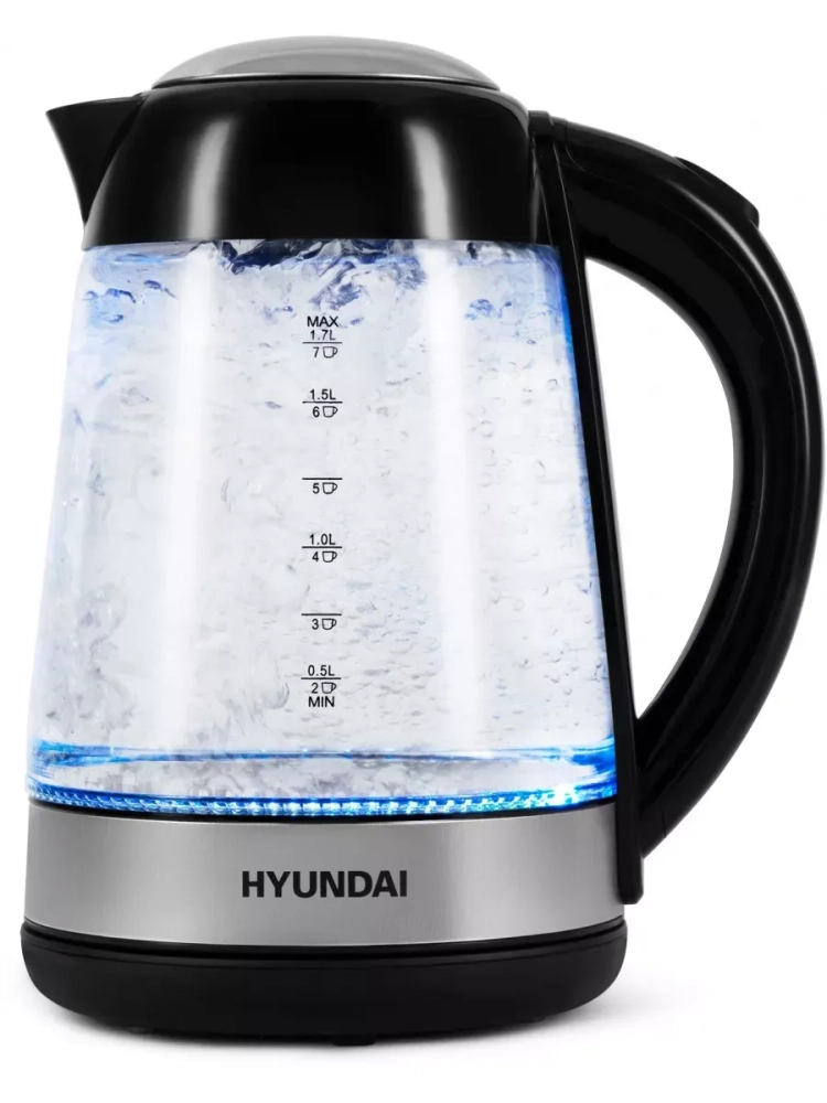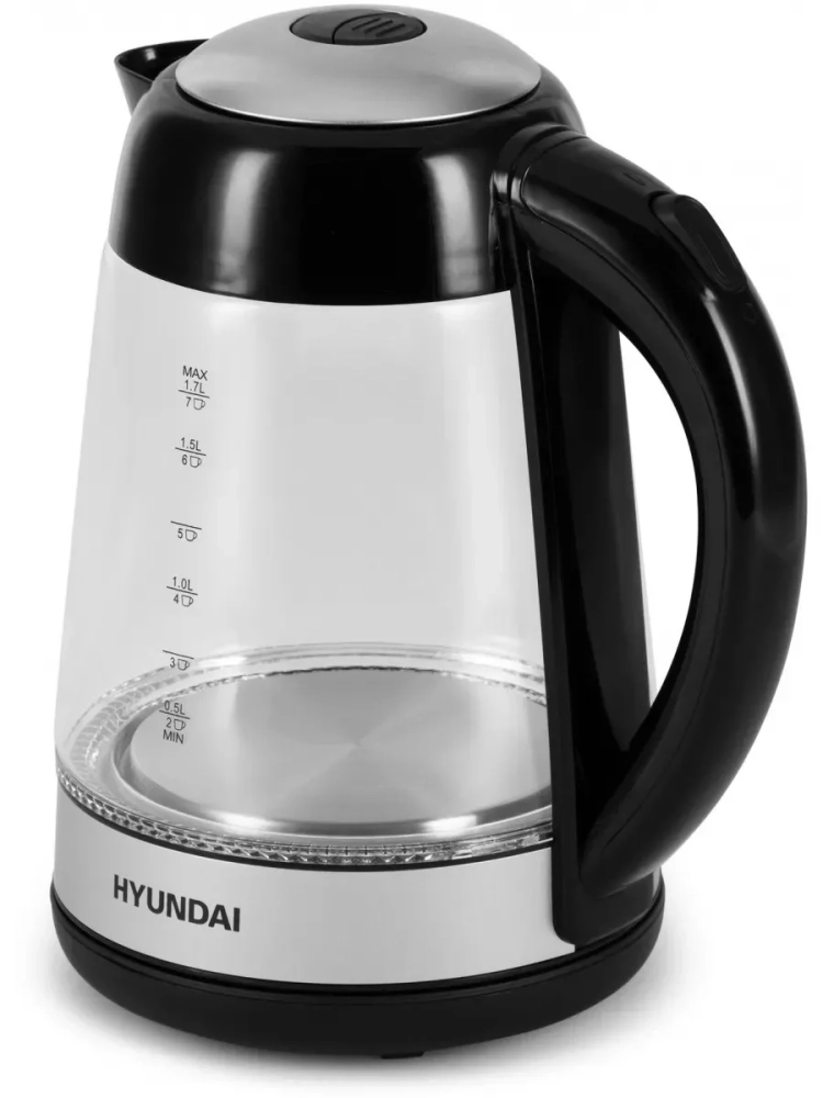 Чайник электрический Hyundai HYK-G3803 черный/серебристый, объём 1.7л, мощность 2200Вт, материал корпуса: стекло.