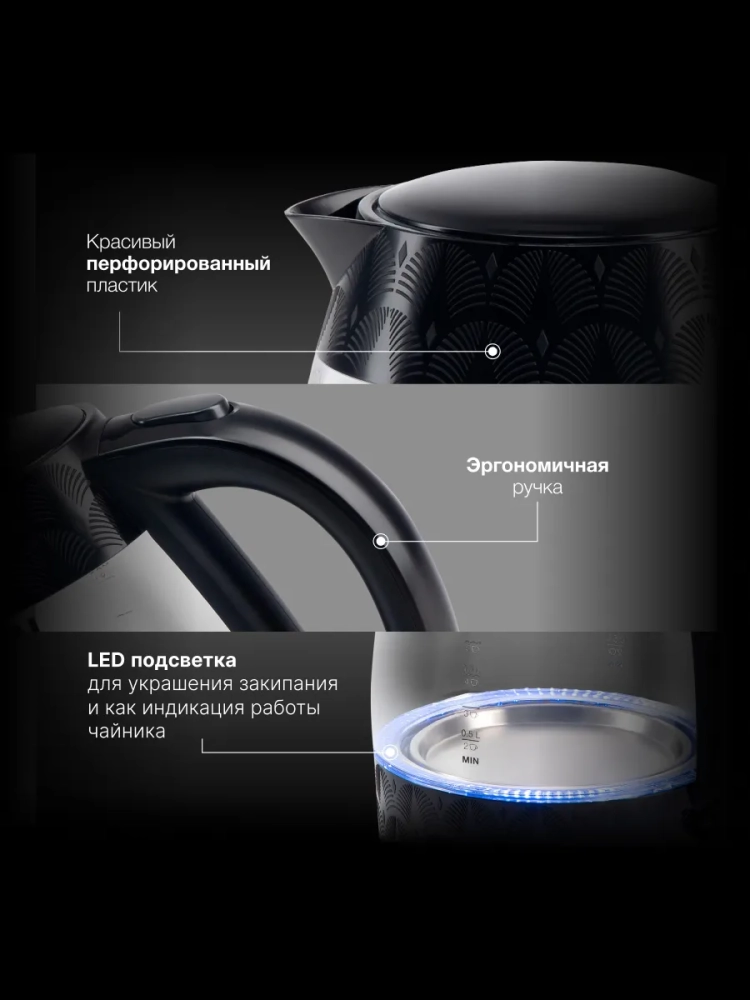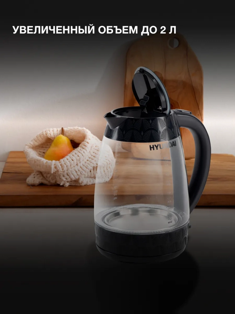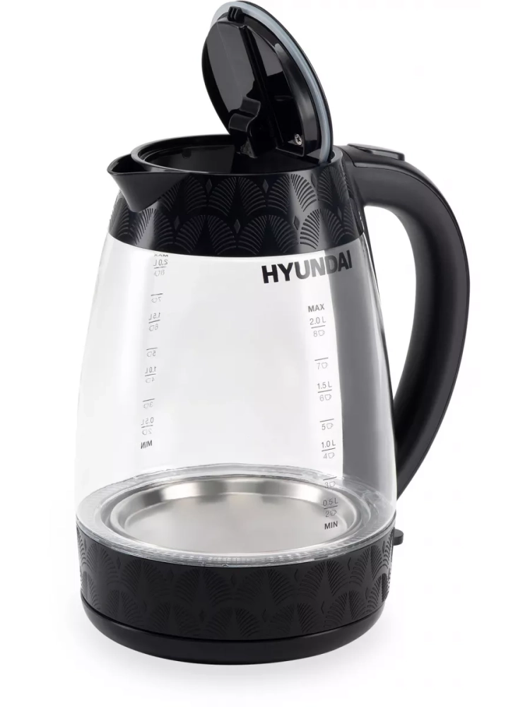 Чайник электрический Hyundai HYK-G4505 черный, объём 2л, мощность 2200Вт, материал корпуса: стекло/пластик
