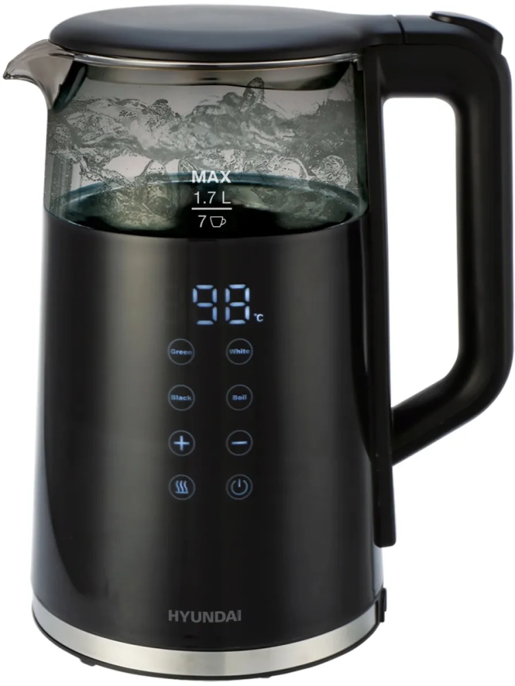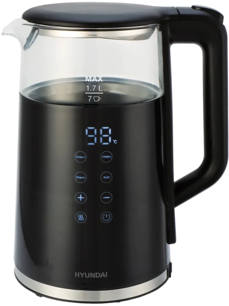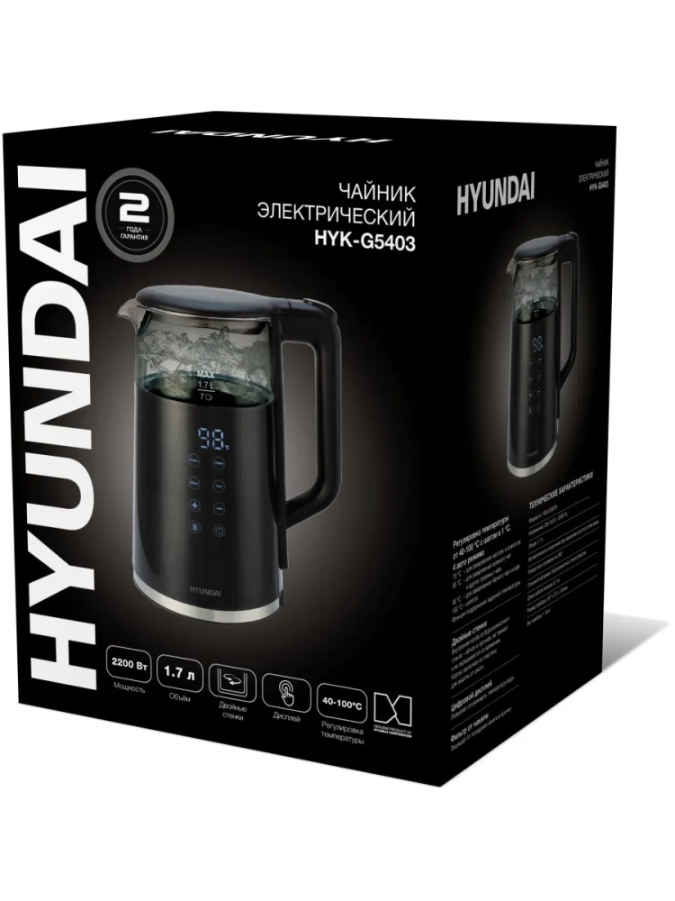 Чайник электрический Hyundai HYK-G5403 черный, объём 1.7л, мощность 2200Вт, материал корпуса: стекло. Индикация включения, уровня воды. Поддержание температуры, регулировка температуры нагрева, автоотключение, защита от включения без воды, дисплей, кнопка открытия крышки, подставка 360, фильтр от накипи.