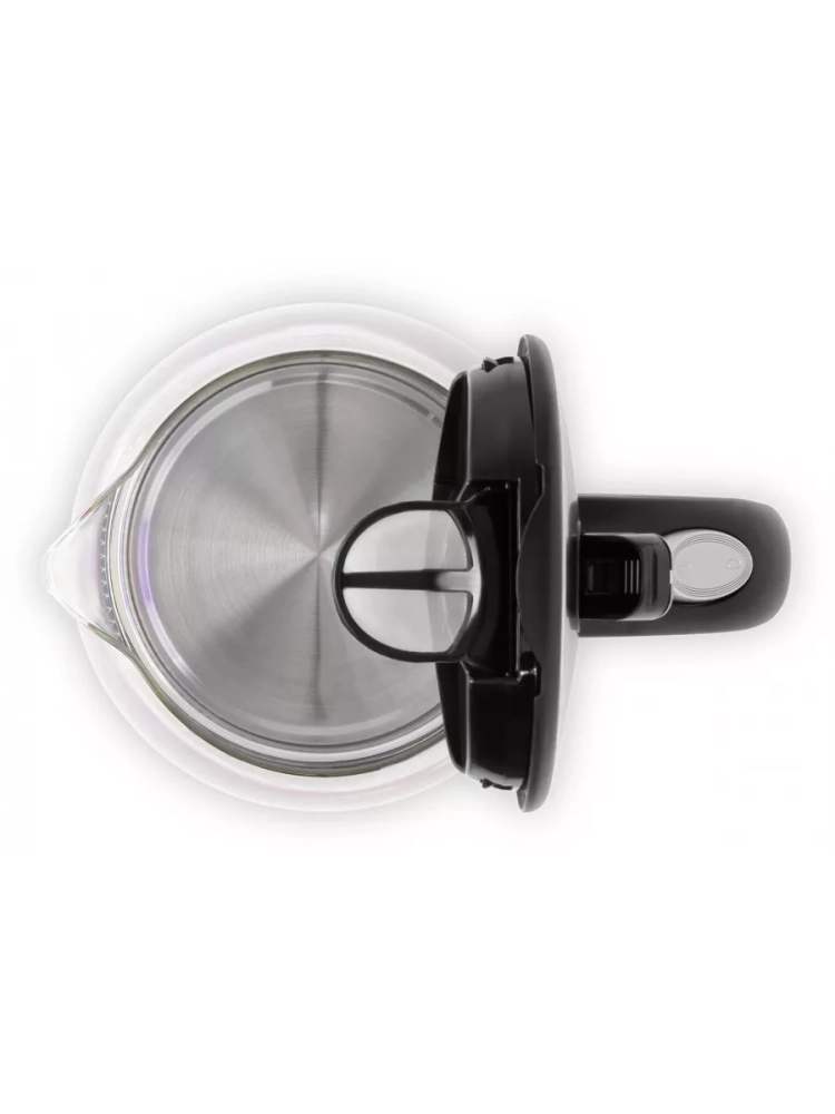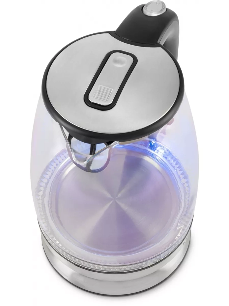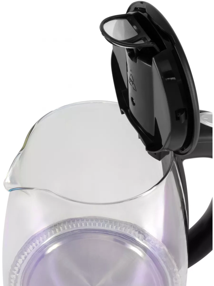 Чайник снабжен кнопкой открытия крышки и подставкой с вращением на 360 градусов.