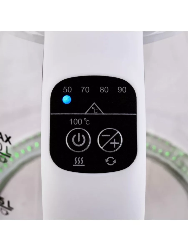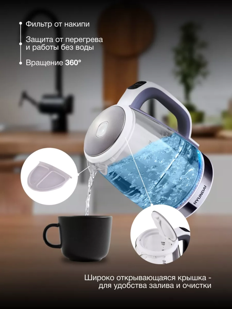 Продуманный дизайн включает в себя удобную широкую крышку для легкого наполнения водой и удобства очистки. Прочная подставка вращается на 360 градусов. Скрытый нагревательный элемент уменьшает количество накипи.