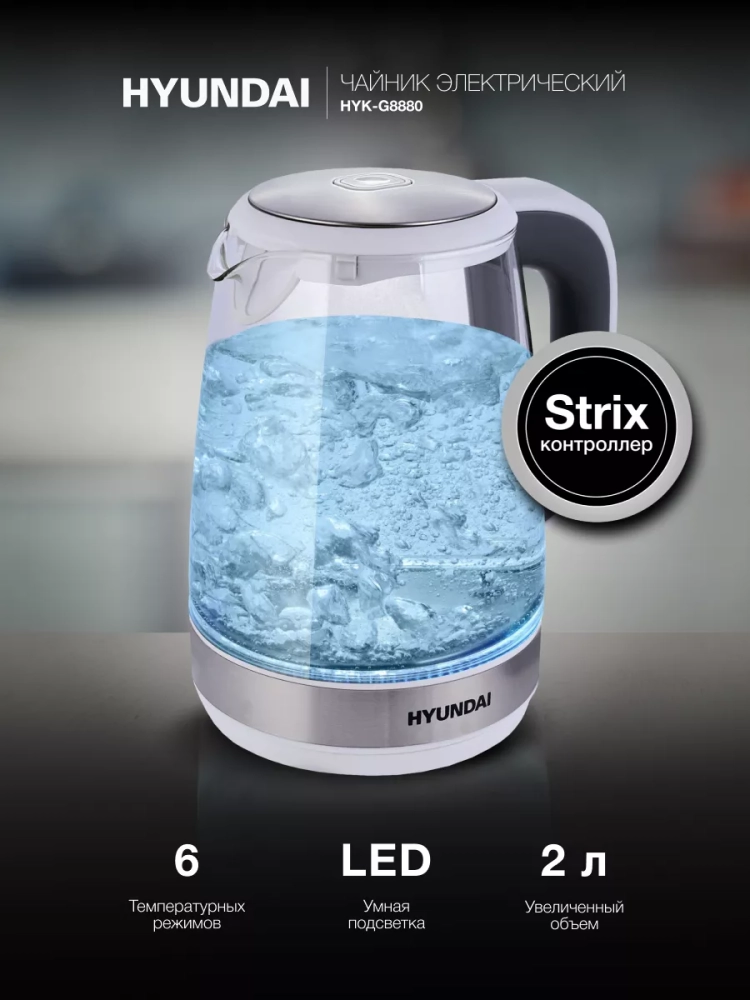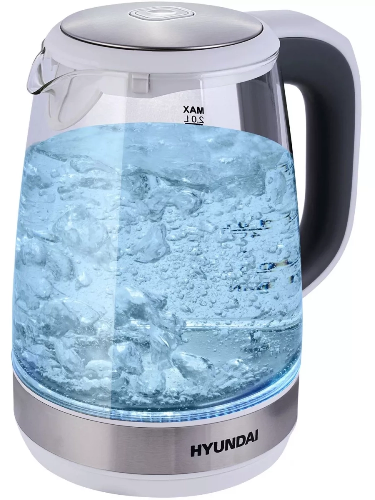 Электрический чайник Hyundai HYK-G8880 оборудован 2200-ваттным нагревательным элементом, быстро и равномерно нагревает до 2 литров воды.