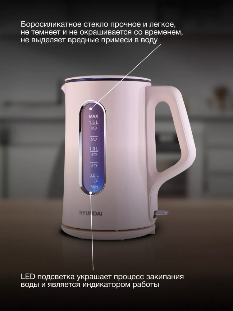 Особенностью данной модели является полностью съемная крышка. Прозрачный корпус позволяет наблюдать за процессом кипения, а красивая LED-подсветка создает завораживающую атмосферу и служит индикатором работы устройства.
