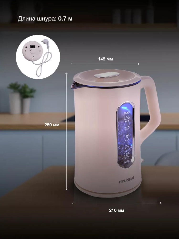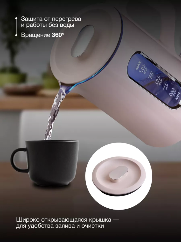 Индикатор уровня воды дает возможность точно контролировать количество заливаемой жидкости. Автоматическое отключение и защита от включения без воды обеспечивают безопасность использования. Удобная подставка с вращением на 360 градусов добавляет комфорта при эксплуатации.