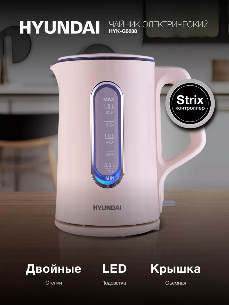Электрический чайник Hyundai HYK-G8888 с мощностью в 1700 Вт обеспечивает быстрый и эффективный нагрев, а объем в 1.5 литра идеально подходит для приготовления напитков для семьи или небольшой компании.