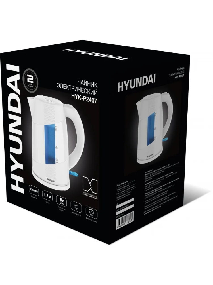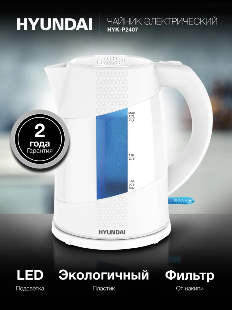 Белый пластиковый электрический чайник Hyundai HYK-P2407 – отличный вариант для тех, кто ценит в бытовой технике простоту, практичность и удобство эксплуатации. В этой модели нет ничего лишнего, но есть всё необходимое, включая индикацию включения и возможность контроля уровня воды без открывания крышки.