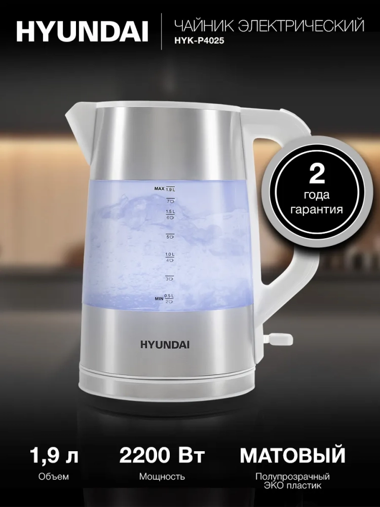 Чайник электрический Hyundai HYK-P4025 белый, объём 1.9л, мощность 2200Вт, материал корпуса: пластик.Уникальный корпус из матового полупрозрачного пищевого пластика.