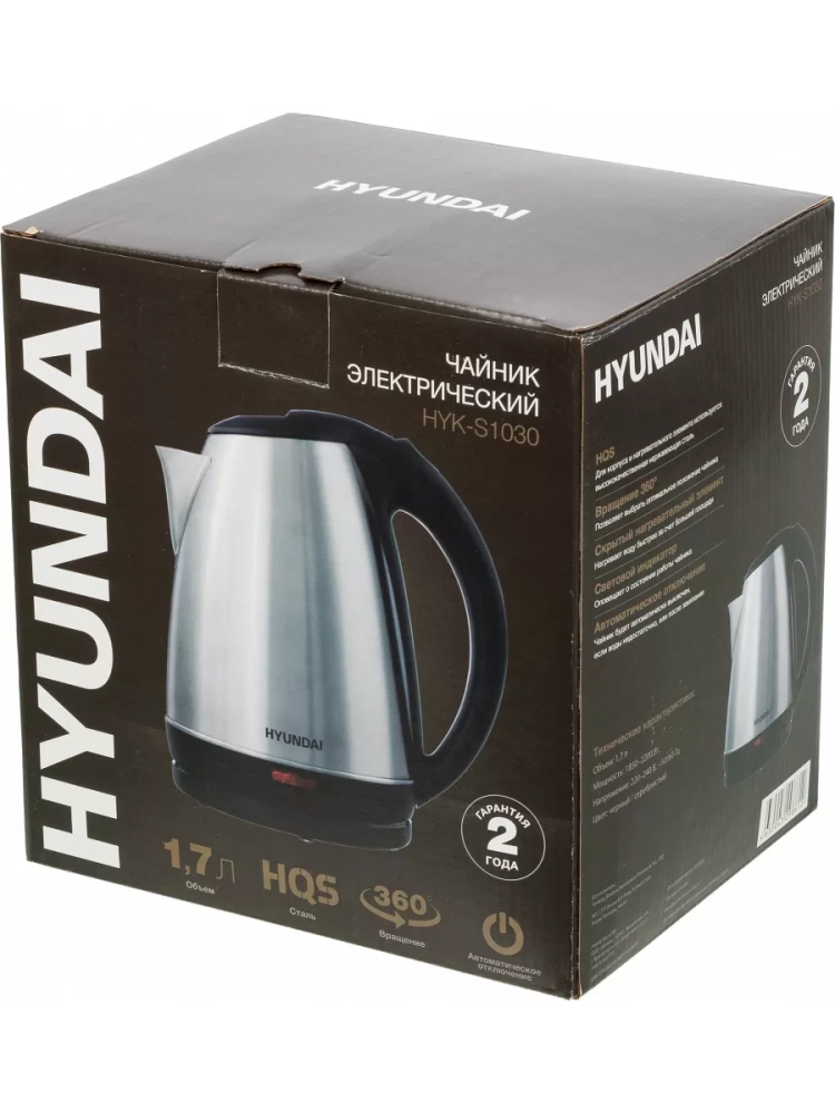 Чайник электрический Hyundai HYK-S1030 серебристый матовый/черный, объём 1.7л, мощность 2200Вт, материал корпуса: металл/пластик. Для корпуса и нагревательного элемента используется высокачественная нержавеющая сталь HQS. 2 года гарантии.
