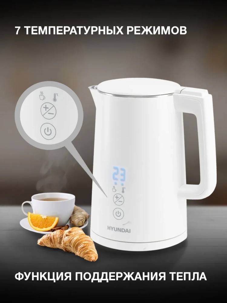 Hyundai HYK-S5508 оснащен интуитивно понятным дисплеем и предлагает 7 настраиваемых температурных режимов (40, 50, 60, 70, 80, 90 и 100 градусов Цельсия). Вы также можете воспользоваться функцией поддержания температуры, чтобы вода оставалась горячей дольше.