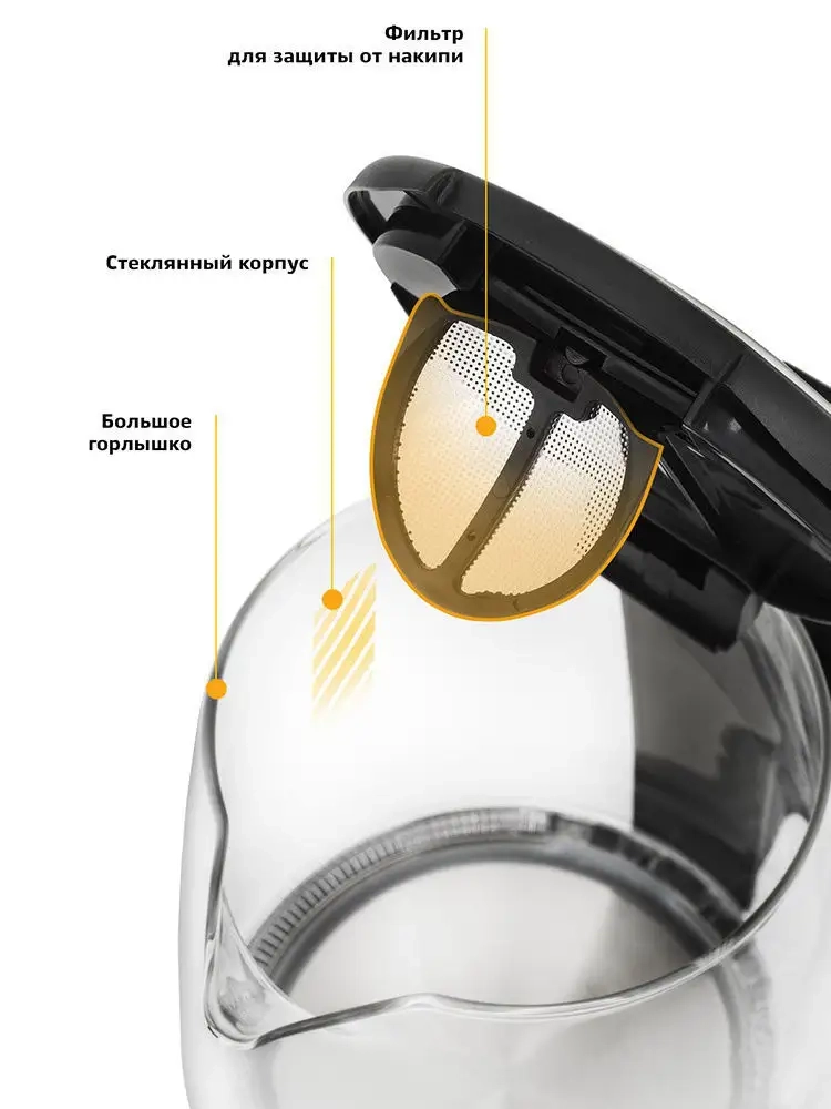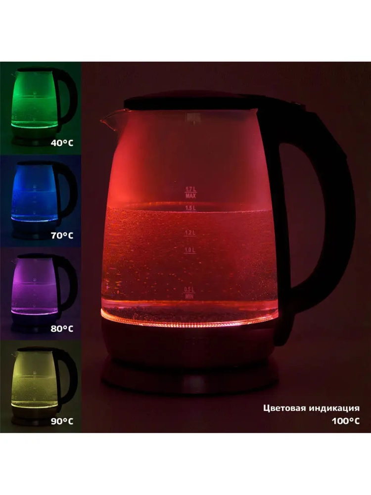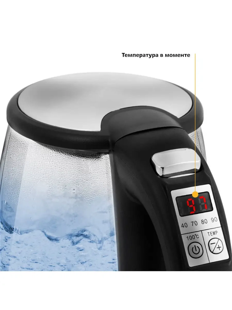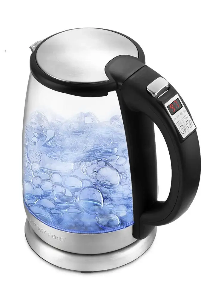 Электрический чайник с терморегулятором Kitfort КТ-628 может не только вскипятить воду, но и нагреть ее до температуры 40, 70, 80 и 90 *С, что очень удобно при заваривании различных сортов чая. Температура 40 *С пригодится для приготовления детского питания. Чайник также оснащен функцией поддержания температуры. Температура воды контролируется встроенным в дно чайника термодатчиком. Корпус чайника выполнен из стекла, а крышка и подставка - из сочетания пластмассы и нержавеющей стали. Мерная шкала нанесена на прозрачную часть корпуса. Большое горлышко чайника облегчает доступ внутрь при его мойке и во время удаления накипи. В носике расположен фильтр от накипи. Ручка чайника пластиковая, не нагревается и удобно лежит в руке. На ручке расположены кнопки выбора режимов работы и световые индикаторы. Чайник автоматически отключается при закипании и при снятии его с подставки, имеет защиту от перегрева и защиту от включения без воды.