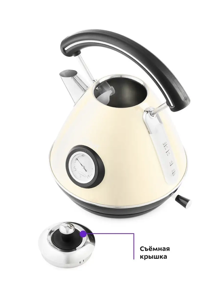 Корпус и крышка чайника выполнены из нержавеющей стали, а подставка - из пластика. Мерная шкала нанесена на корпус сзади. Ручка чайника пластиковая, не нагревается и удобно лежит в руке. Кнопка включения чайника расположена на корпусе снизу, на противоположной стороне от носика. При включении чайника загорается индикатор работы. На корпусе чайника расположен термометр биметаллического типа, который показывает температуру воды в чайнике. Это удобно, если вы готовите напитки, для которых требуются определенная температура воды, например, зеленый чай, белый чай, кофе и т. д. Для корректной работы термометра наполняйте чайник водой выше минимального уровня. В носике чайника расположен съемный фильтр от накипи из нейлона, который задерживает частички накипи и предотвращает попадание их в чашку.