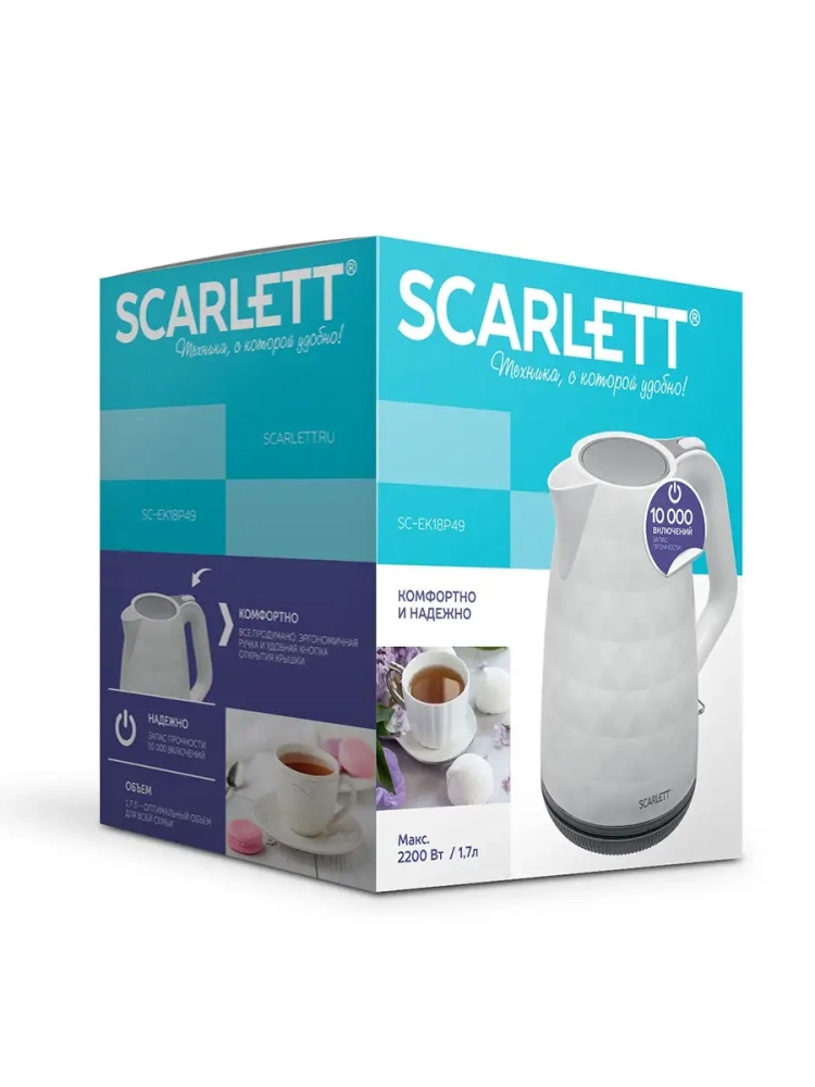Электрический чайник с оптимальным объемом 1,7 л оснащён удобной шкалой для контроля уровня воды. Эргономичная ручка, автоматическая система открытия крышки, закрытый нагревательный элемент сделают эксплуатацию прибора еще проще и комфортнее.