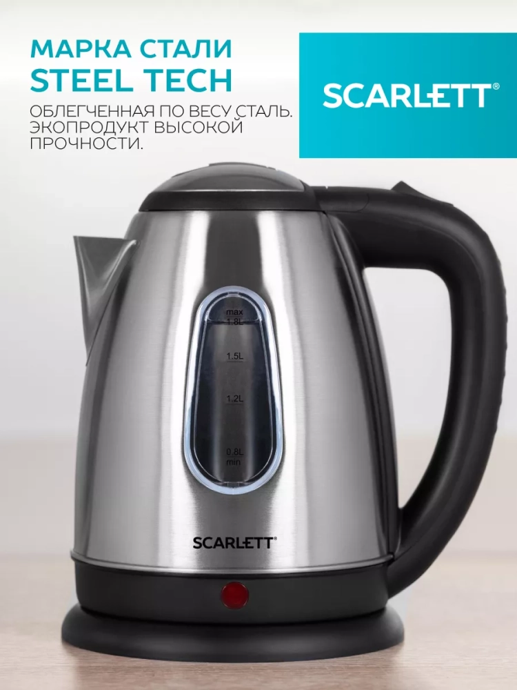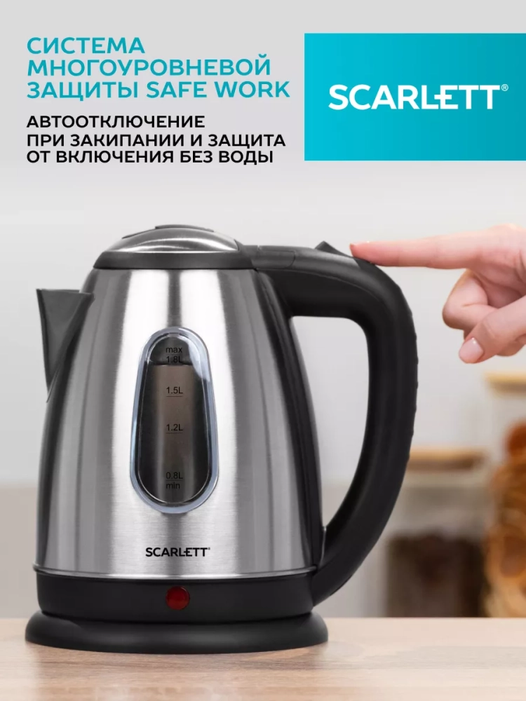 Электрический чайник с увеличенным объемом 1,8 л оснащён большим прозрачным окном для контроля уровня воды. Эргономичная ручка, традиционная система открытия крышки, закрытый нагревательный элемент сделают эксплуатацию прибора еще проще и комфортнее.
