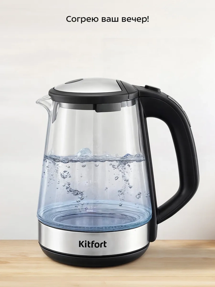Чайник автоматически отключается при закипании, имеет защиту от перегрева и от включения без воды.