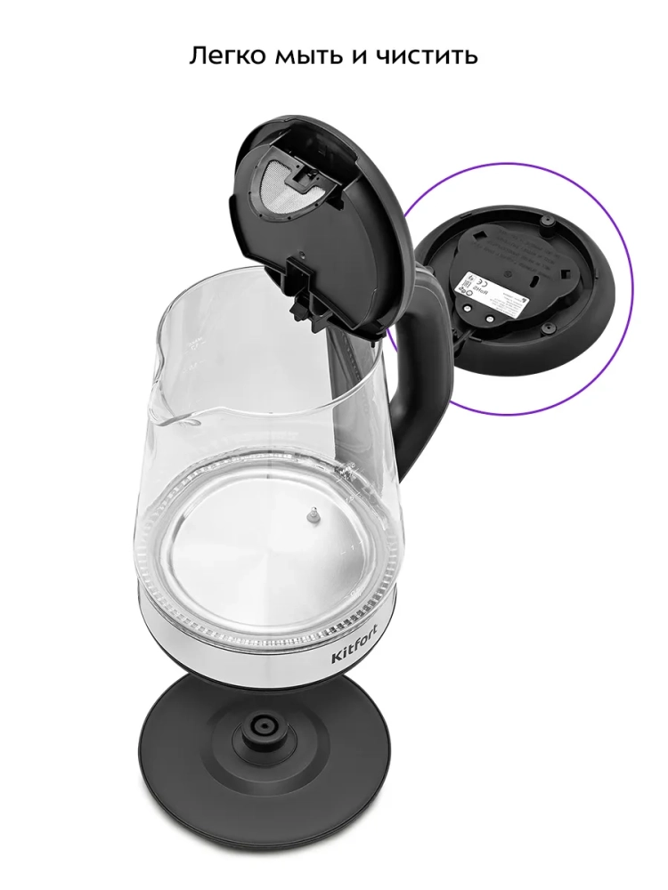 Подставка с центральным контактом дает возможность располагать на ней чайник в любом положении, обеспечивая вращение на 360°. Снизу имеется отсек для хранения шнура, в который можно смотать излишки шнура электропитания, чтобы он не мешал на столе.