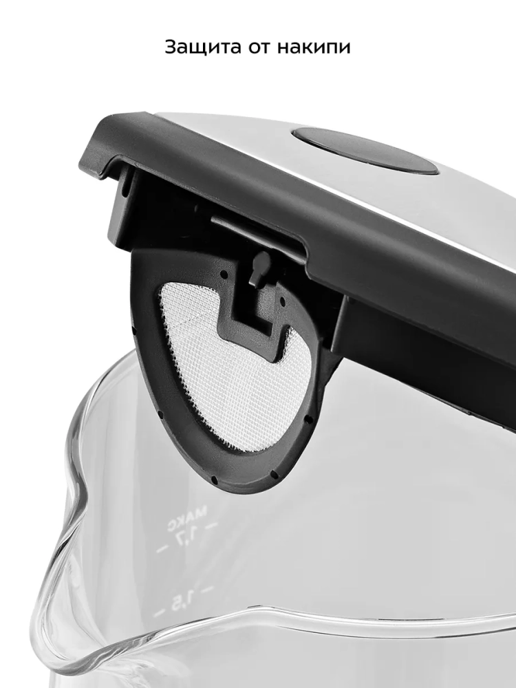 Корпус чайника выполнен из стекла. Крышка и подставка сделаны из пластмассы. Мерная шкала нанесена на прозрачную часть корпуса. Крышка чайника открывается при нажатии на кнопку сверху ручки. Ручка чайника пластиковая, не нагревается и удобно лежит в руке. На ручке расположены дисплей, кнопка включения, кнопка выбора температуры и поддержания температуры.
