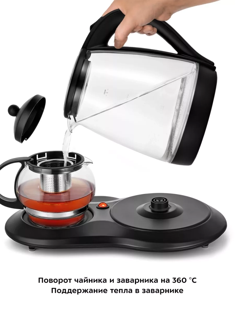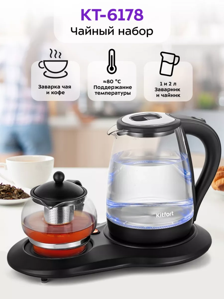 Стильный и функциональный чайный набор Kitfort КТ-6178 состоит из чайника емкостью 2 л, кувшина с фильтром для заварки емкостью 1 л и базы. Набор поможет вам не только вскипятить воду, но и заварить чай или кофе.