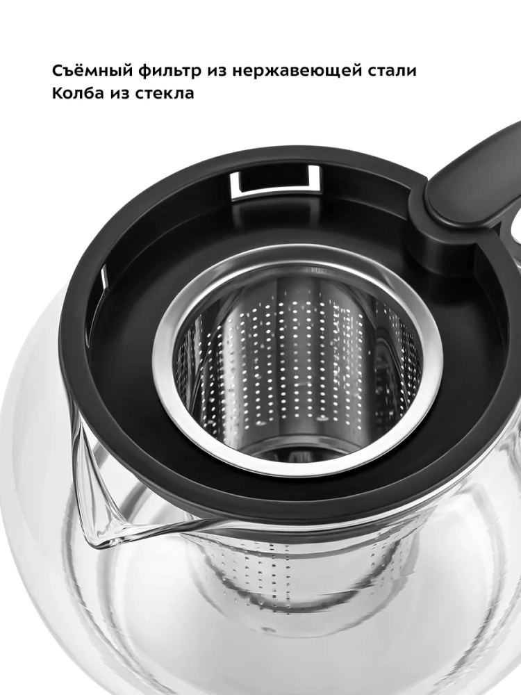 Кувшин для заварки изготовлен из термостойкого стекла и имеет съемный фильтр для чая или кофе. В месте установки кувшина на базу присутствует скрытый нагревательный элемент с функцией поддержания тепла.