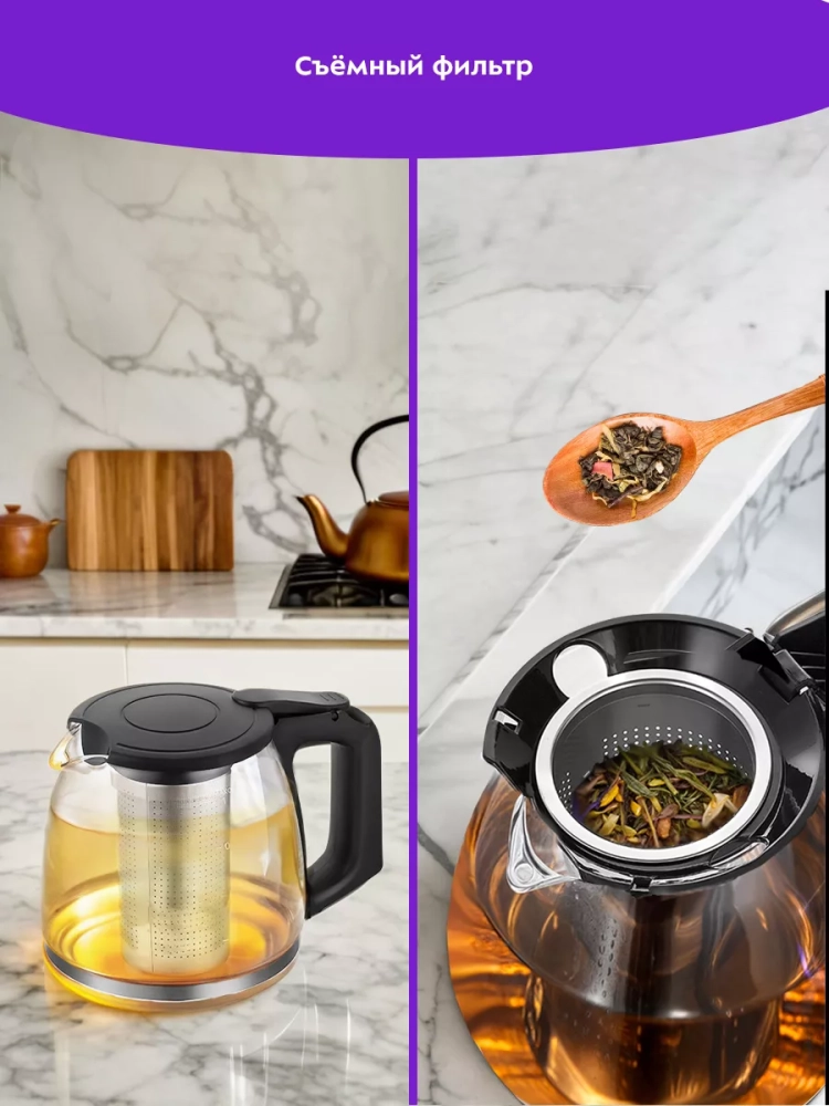 Заварочный чайник изготовлен из стекла и имеет съемный фильтр для чая или кофе. В месте установки заварочного чайника на базу находится платформа с подогревом, благодаря которой готовый напиток остается теплым.