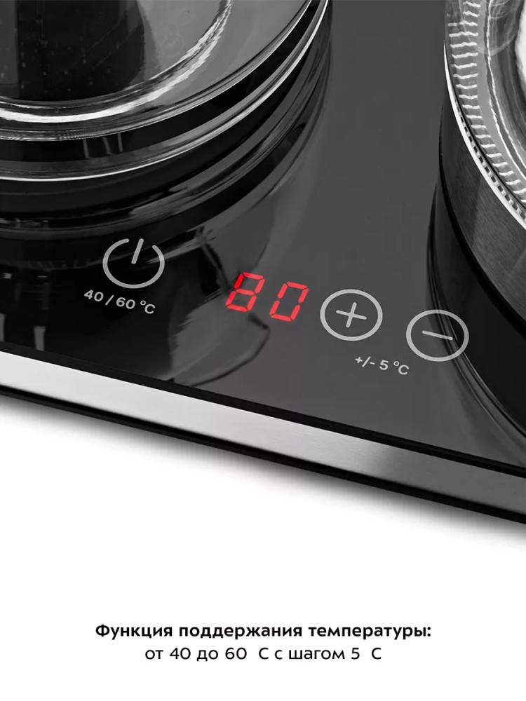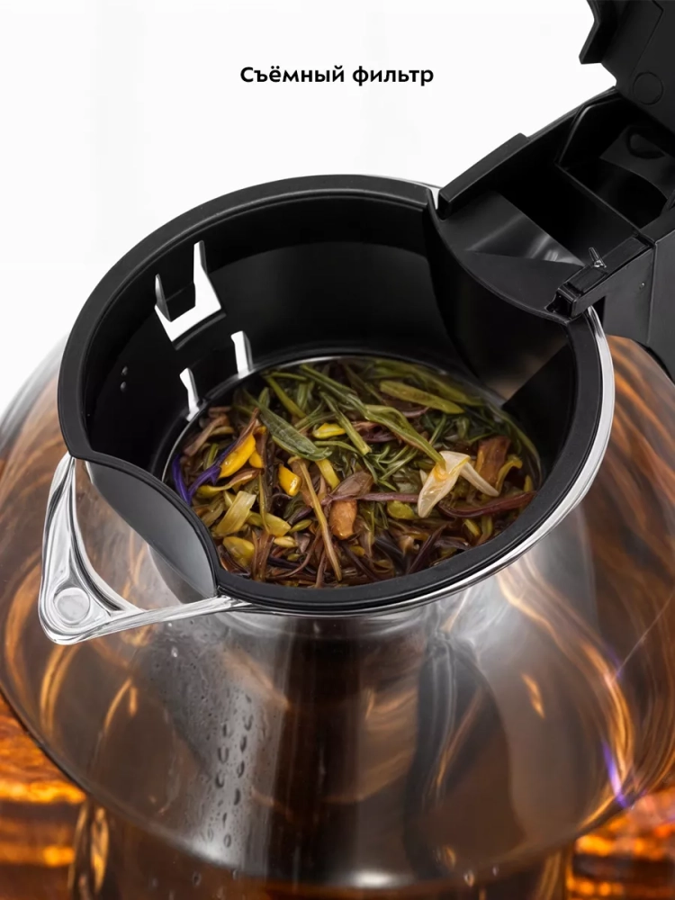 Заварочный чайник изготовлен из стекла и имеет съемный фильтр для чая или кофе. В месте установки заварочного чайника на базу находится платформа с подогревом, благодаря которой вы можете сохранить готовый напиток теплым. Вы можете выбрать поддержание температуры от 40 до 60 °С с шагом 5 °С.