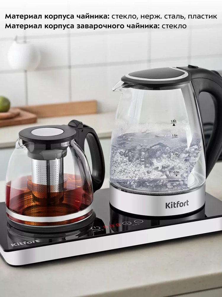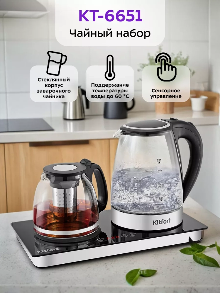 Чайный набор Kitfort КТ-6651 состоит из чайника емкостью 1,8 л, заварочного чайника с фильтром емкостью 1,2 л и базы. Набор поможет вам не только вскипятить воду, но и заварить чай или кофе, а также сохранять готовый напиток теплым.