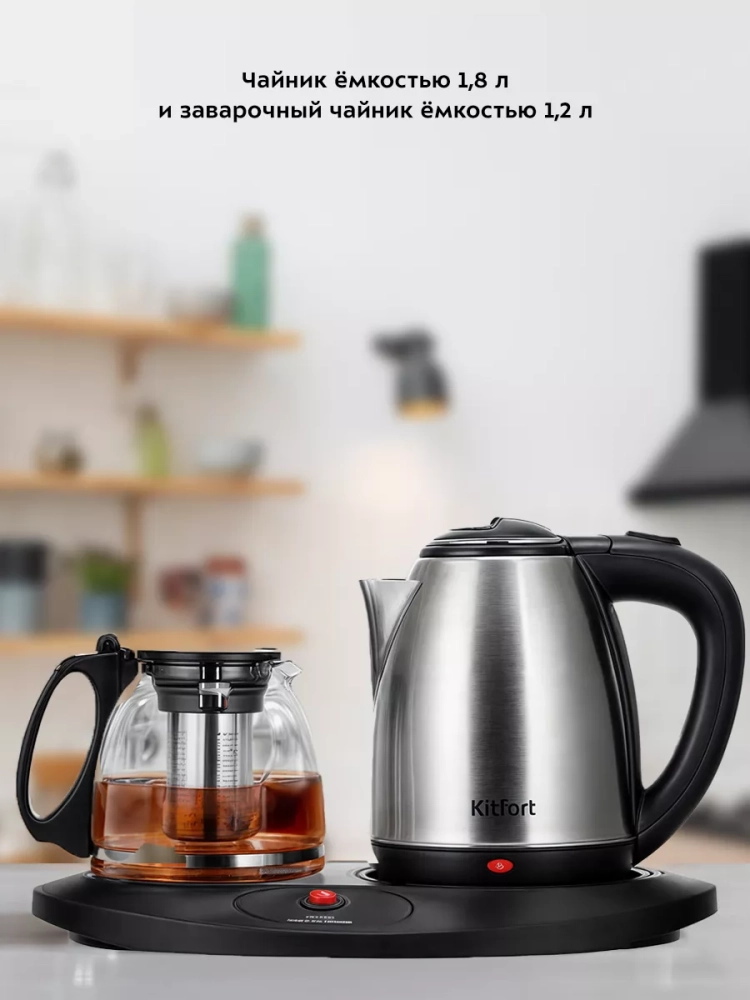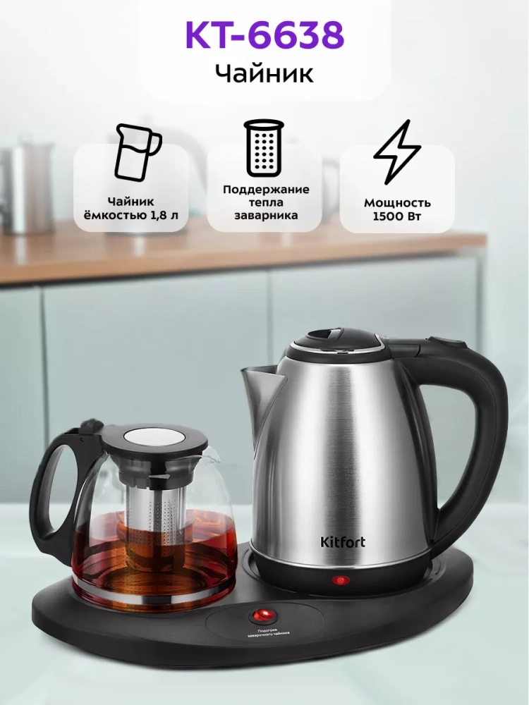 Чайный набор Kitfort КТ-6638 состоит из чайника емкостью 1,8 л, заварочного чайника с фильтром для заварки емкостью 1,2 л и базы. Набор поможет вам не только вскипятить воду, но и заварить чай или кофе, а также сохранять готовый напиток теплым.