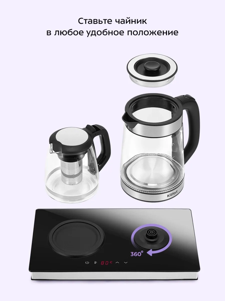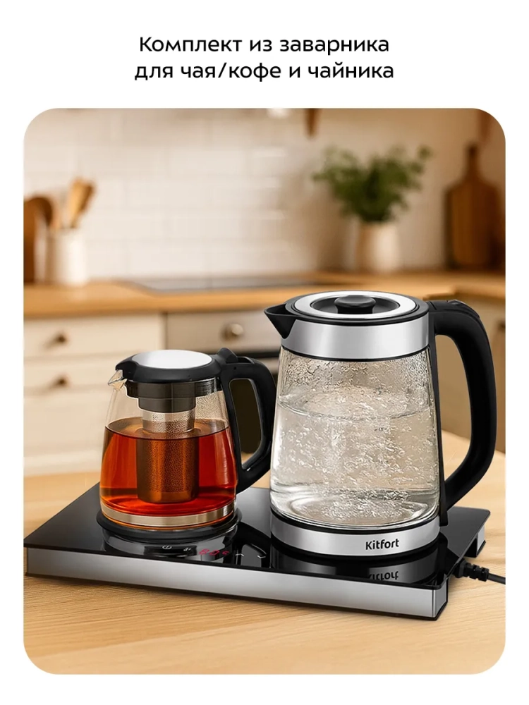 Чайный набор Kitfort КТ-6736 состоит из чайника емкостью 2 л, заварочного чайника емкостью 1,2 л с фильтром и базы. Чайный набор позволяет не только вскипятить воду, но и заварить чай или кофе в заварочном чайнике, а также сохранить готовый напиток теплым за счет встроенной платформы с подогревом.