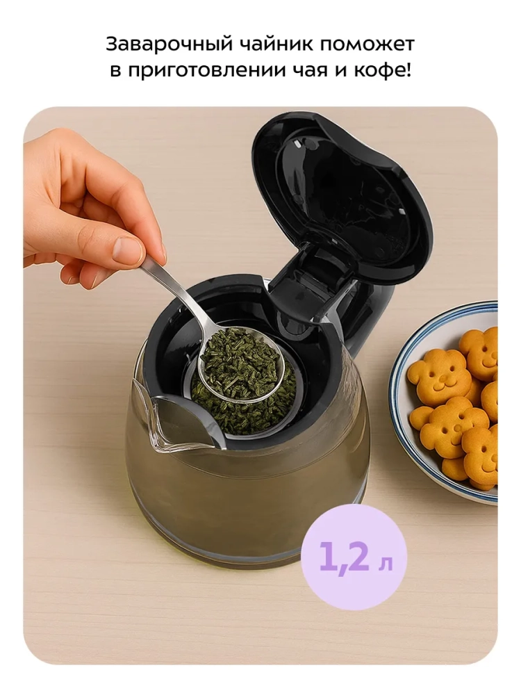 Заварочный чайник изготовлен из термостойкого стекла и имеет съемный фильтр из нержавеющей стали для чая или кофе. В месте установки заварочного чайника на базе находится платформа с подогревом, благодаря которой можно сохранять готовый напиток теплым.