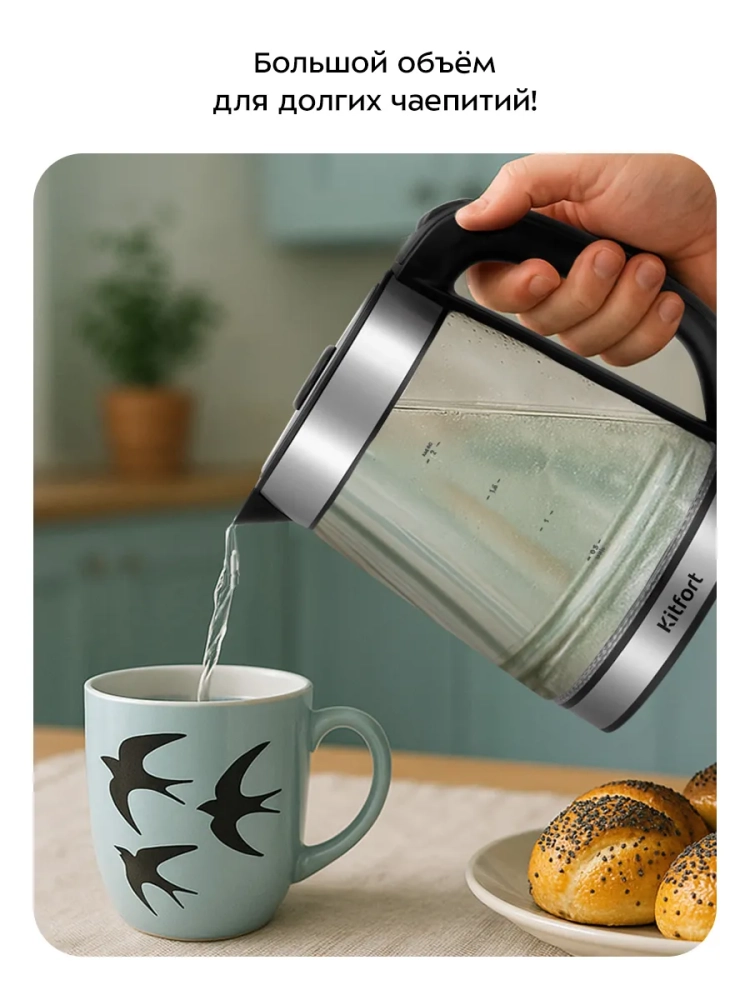 Чайник - внешняя часть корпуса выполнена из пластика и нержавеющей стали, а внутренняя — из стекла. Крышка чайника пластиковая со вставками из нержавеющей стали. Мерная шкала с отметками для минимального и максимального уровня воды нанесена на прозрачную часть корпуса. Пластиковая ручка чайника позволяет удобно держать его в руке: ручка не скользит и не нагревается благодаря особенностям конструкции.