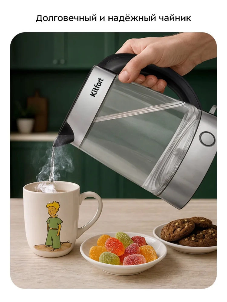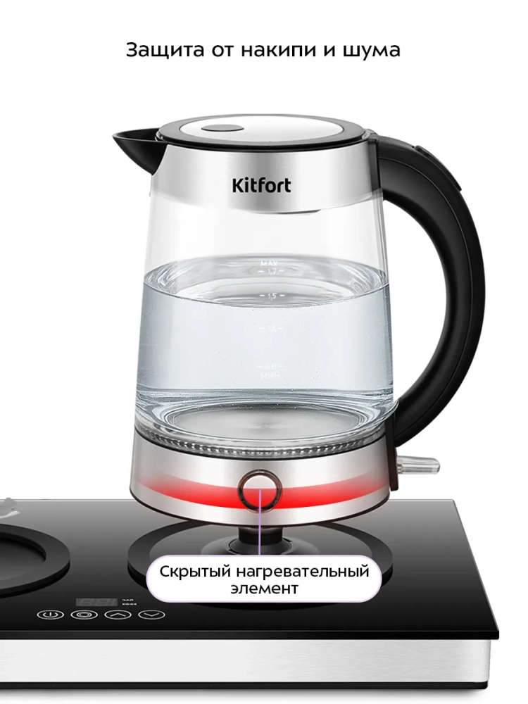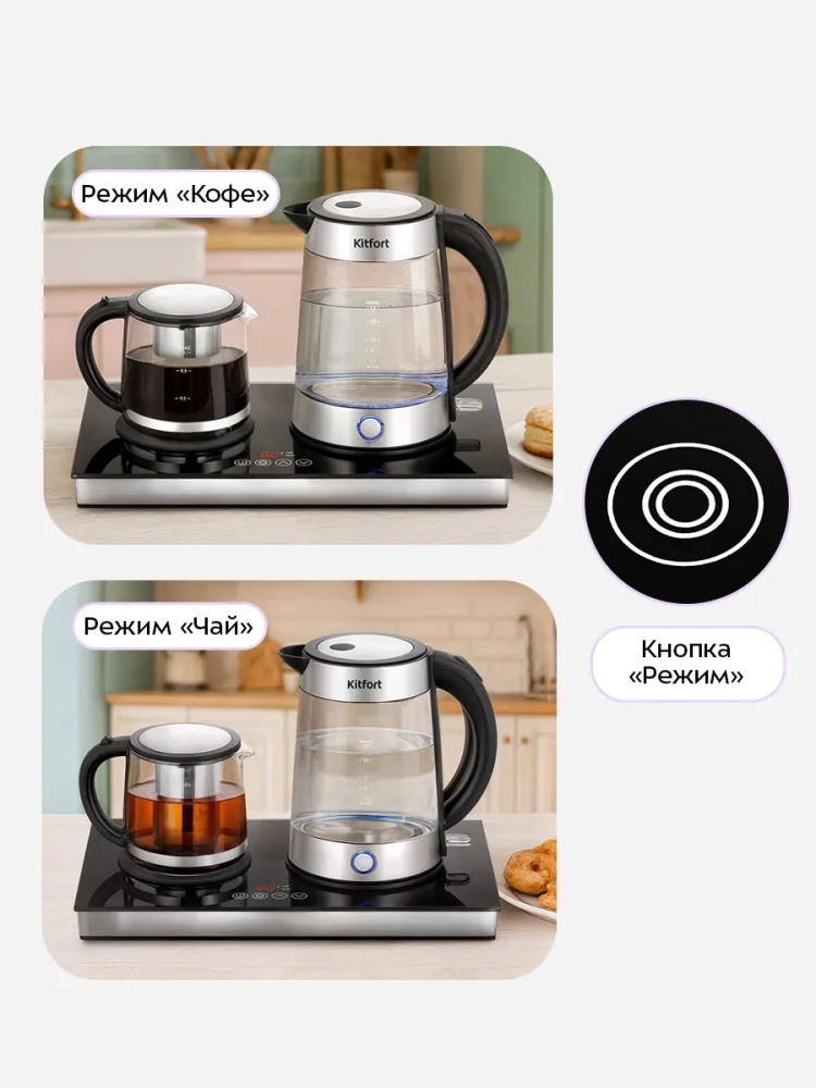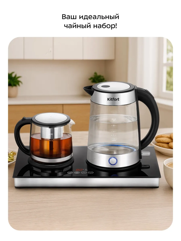 Чайный набор Kitfort КТ-6741 состоит из чайника емкостью 1,7 л, заварочного чайника емкостью 1 л с фильтром и базы. Чайный набор позволяет не только вскипятить воду, но и заварить чай или кофе в заварочном чайнике, а также сохранить готовый напиток теплым в течение 4 часов за счет встроенной платформы с подогревом.