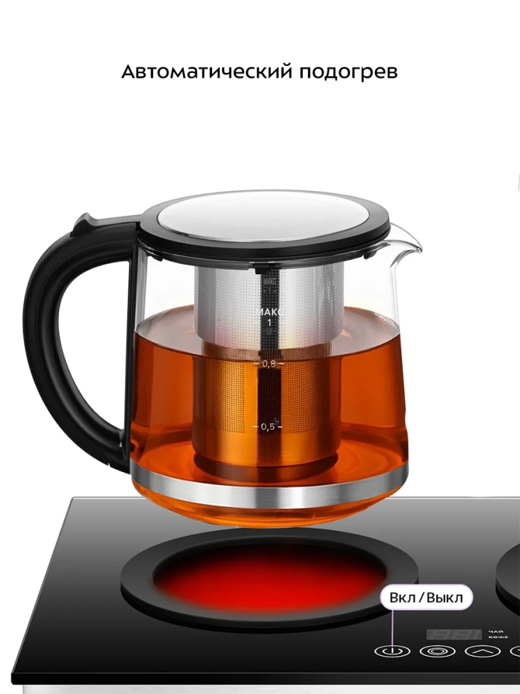 В данной модели предусмотрено два режима работы платформы с подогревом: режим «Чай» и режим «Кофе». На базе расположена панель управления с сенсорными кнопками для выбора режима работы и установки температуры платформы с подогревом. В режиме «Чай» можно установить температуру нагрева от 60 до 80 °С (по умолчанию выбрано 70 °С), в режиме «Кофе» — от 75 до 85 °С (по умолчанию выбрано 80 °С). Шаг установки в обоих режимах составляет 1 °С. На дисплее во время работы платформы с подогревом отображается установленная температура нагрева.