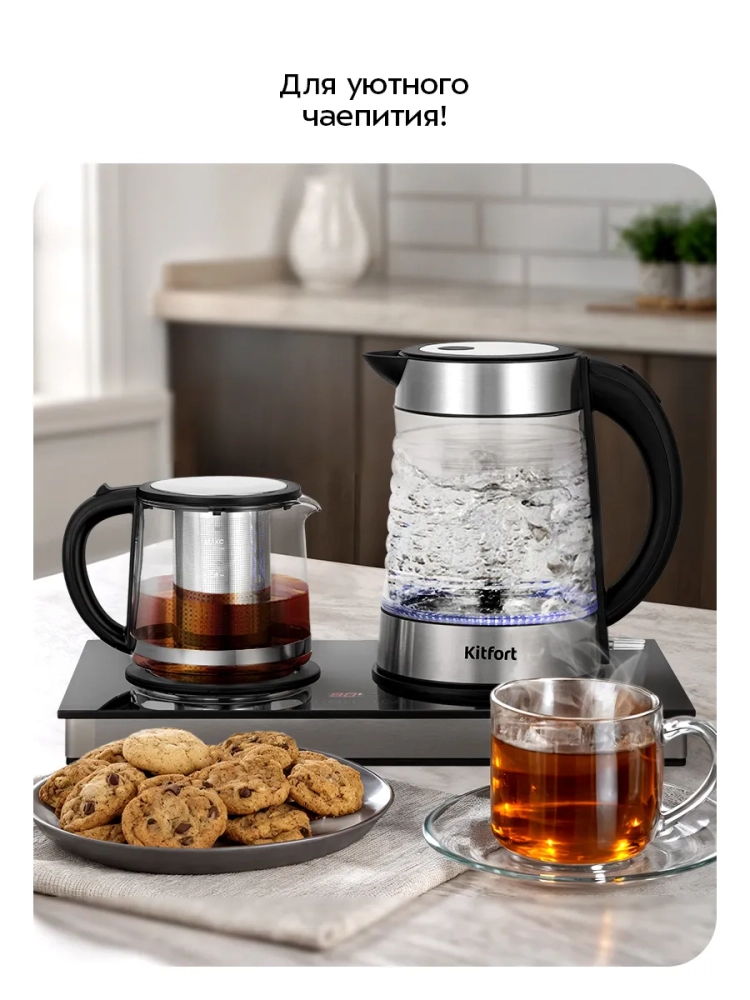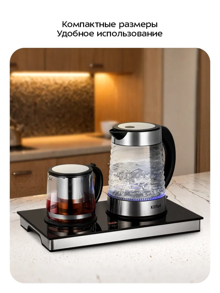 Чайный набор Kitfort КТ-6745 состоит из чайника емкостью 1,7 л, заварочного чайника емкостью 1 л с фильтром и базы. Чайный набор позволяет не только вскипятить воду, но и заварить чай или кофе в заварочном чайнике, а также сохранить готовый напиток теплым в течение 4 часов за счет встроенной платформы с подогревом.