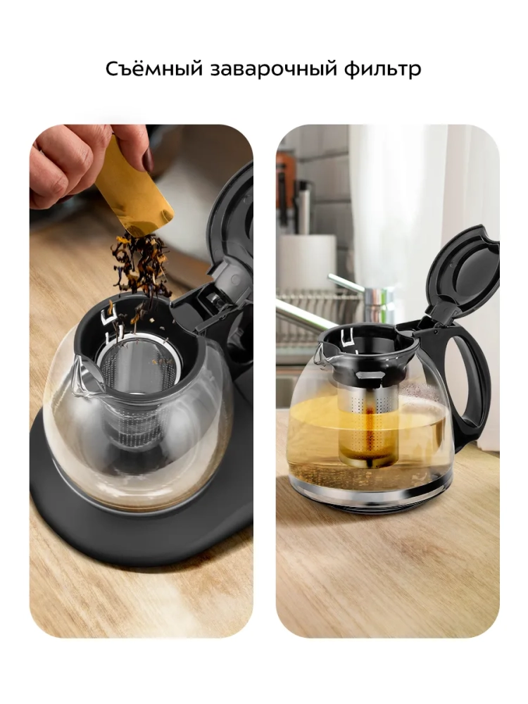 Заварочный чайник изготовлен из термостойкого стекла. На корпусе чайника есть вставка из нержавеющей стали. Чайник имеет съемный фильтр из нержавеющей стали для чая или кофе. В месте установки заварочного чайника на базу находится платформа с подогревом, благодаря которой можно сохранять готовый напиток теплым. Температура подогрева платформы составляет 60 °C.