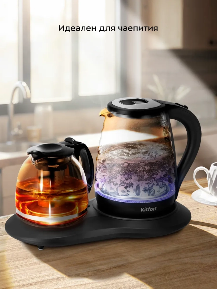 Чайный набор Kitfort КТ-6732 состоит из чайника емкостью 2 л, заварочного чайника емкостью 1,2 л с фильтром для заварки и базы. Набор поможет вам не только вскипятить воду, но и заварить чай или кофе, а также сохранить готовый напиток теплым.