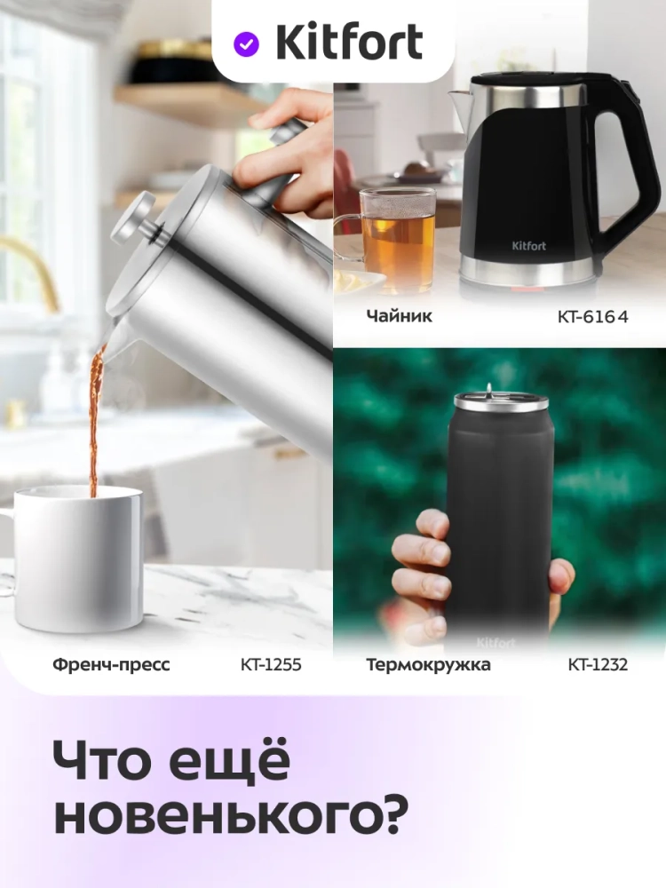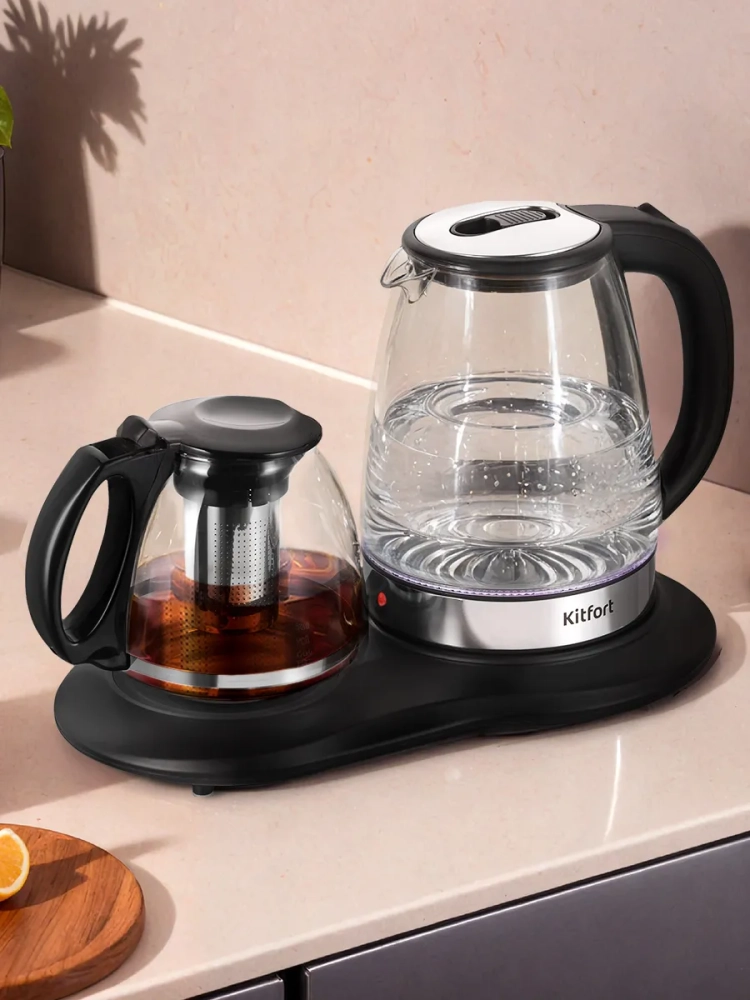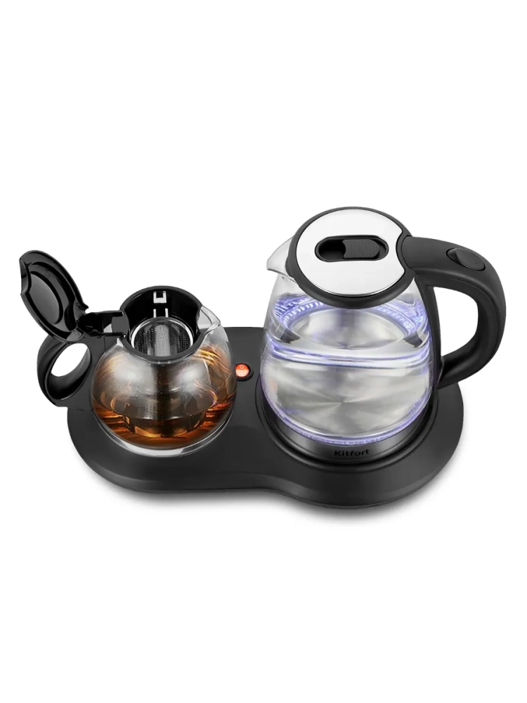 Чайный набор Kitfort КТ-6733 состоит из чайника емкостью 2 л, заварочного чайника с фильтром емкостью 1,2 л и базы. Набор поможет вам не только вскипятить воду, но и заварить чай или кофе, а также сохранить готовый напиток теплым.