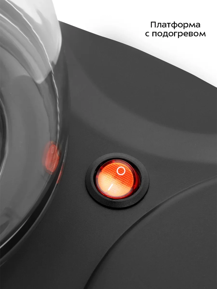 Заварочный чайник изготовлен из термостойкого стекла и имеет съемный фильтр из нержавеющей стали для чая или кофе. В месте установки заварочного чайника на базу находится платформа с подогревом, благодаря которой можно сохранять готовый напиток теплым. Температура платформы с подогревом составляет 60 °C.