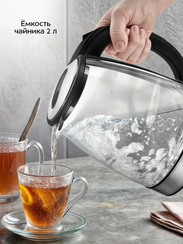 Корпус чайника выполнен из стекла и нержавеющей стали, а крышка — из пластика и нержавеющей стали. Мерная шкала с отметками для минимального и максимального уровня воды нанесена на прозрачную часть корпуса. Пластиковая ручка чайника позволяет удобно держать его в руке: ручка не скользит и не нагревается благодаря особенностям конструкции.