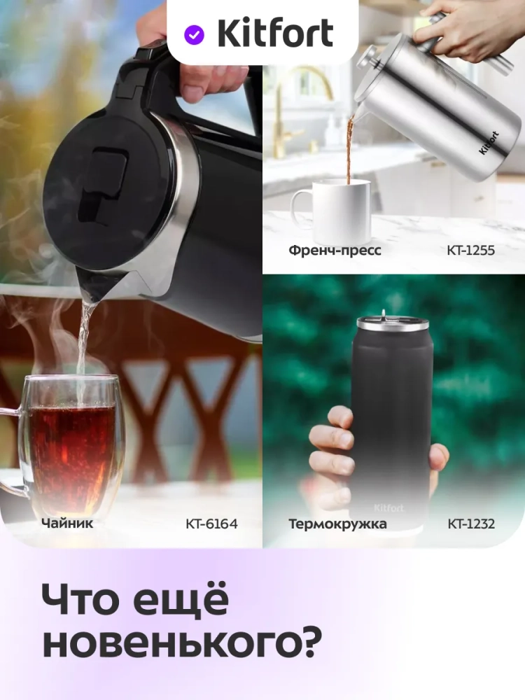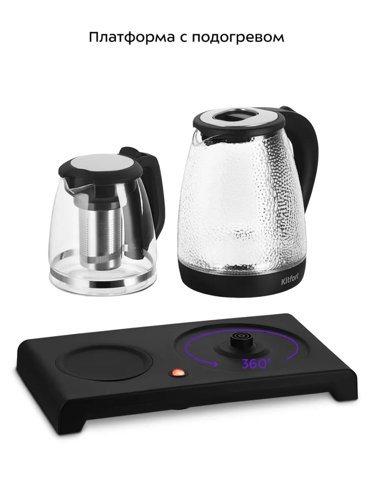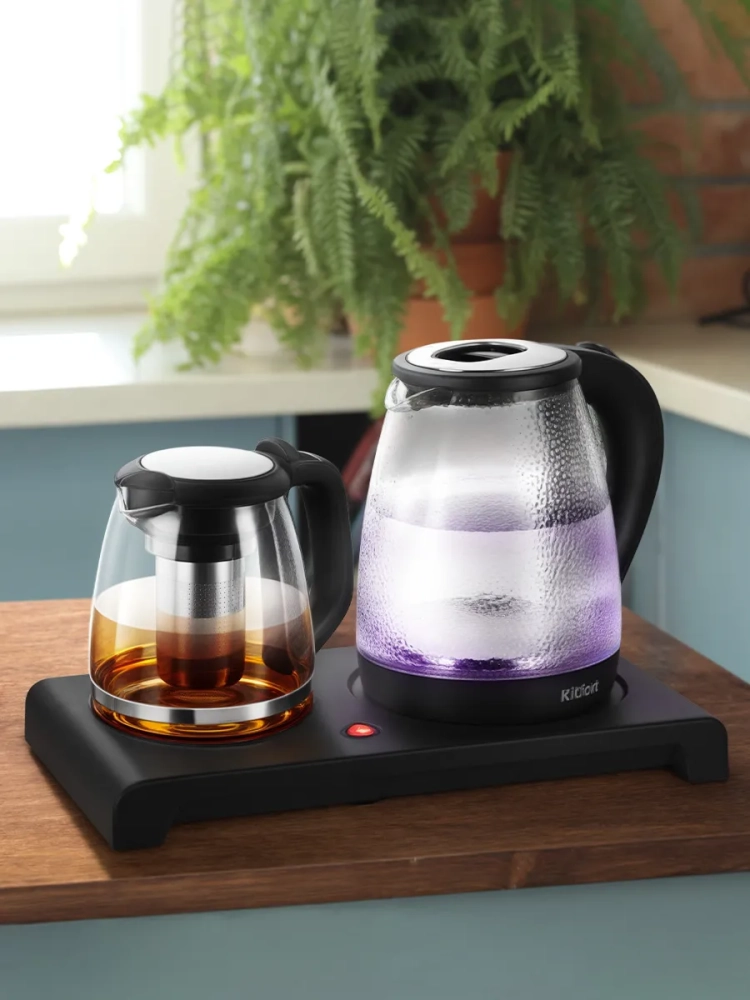 Чайный набор Kitfort КТ-6734 состоит из чайника емкостью 2 л, заварочного чайника с фильтром емкостью 1,2 л и базы. Набор поможет вам не только вскипятить воду, но и заварить чай или кофе, а также сохранить готовый напиток теплым.