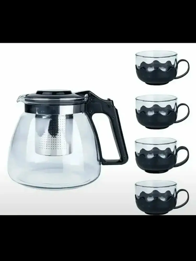 Набор чайный, чайник стеклянный заварочный 900 мл, с металлическим ситом, 4 кружки, 150 мл. Набор чайный состоит из четырёх кружек 150 мл и заварочного стеклянного чайника с металлическим ситом объёмом 900 мл. Подходит для заваривания всех сортов чая и травяных смесей. Легко моется, не впитывает посторонние запахи. Отлично впишется в дизайн любой кухни. Рекомендуется мыть вручную с применением мягких моющих средств. Не использовать для ухода абразивные чистящие средства и жёсткие губки. Можно мыть в посудомоечной машине на щадящем режиме. Можно использовать в СВЧ-печи: да. Можно мыть в посудомоечной машине: да. Текстура: Гладкая. Выпить кружечку горячего свежезаваренного чая - самое приятное в течении дня. А полностью насладиться процессом чаепития поможет стеклянный чайный сервиз с заварочным чайником и чашками на 4 персоны. Благодаря термостойкому стеклу, из которого сделан сервиз, Вы будете наслаждаться самым горячим чаем! Изделия содержат пластиковую фурнитуру черного цвета, что обеспечит прекрасное сочетание с интерьером Вашей кухни!