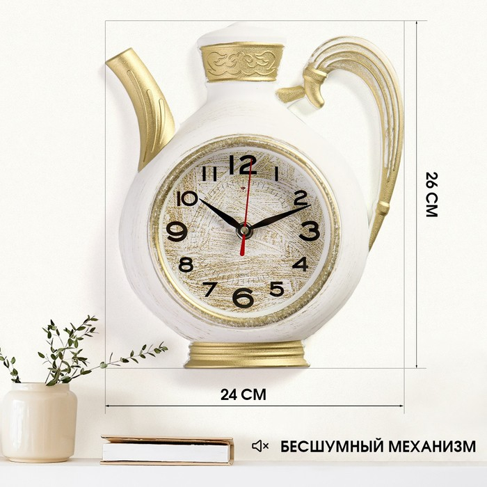 Часы настенные интерьерные для кухни "Чайник", бесшумные, 26.5 х 24 см, белые с золотом, АА