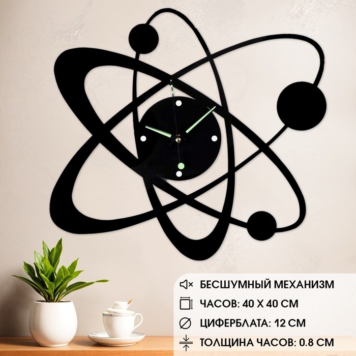 Часы настенные из металла "Космос", плавный ход, 40 х 40 см, d-12 см, светящиеся. Эти настенные часы с металлическим корпусом и космическим дизайном станут отличным дополнением к Вашему интерьеру. Размеры составляют 40 x 40 см, а диаметр циферблата - 12 см. Благодаря плавному ходу, механизм работает бесшумно и точно, а светящиеся элементы на циферблате помогут определить время в темное время суток. Настенные часы "Космос", идеально подойдут для офиса, дома или любого другого помещения.