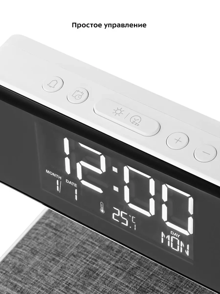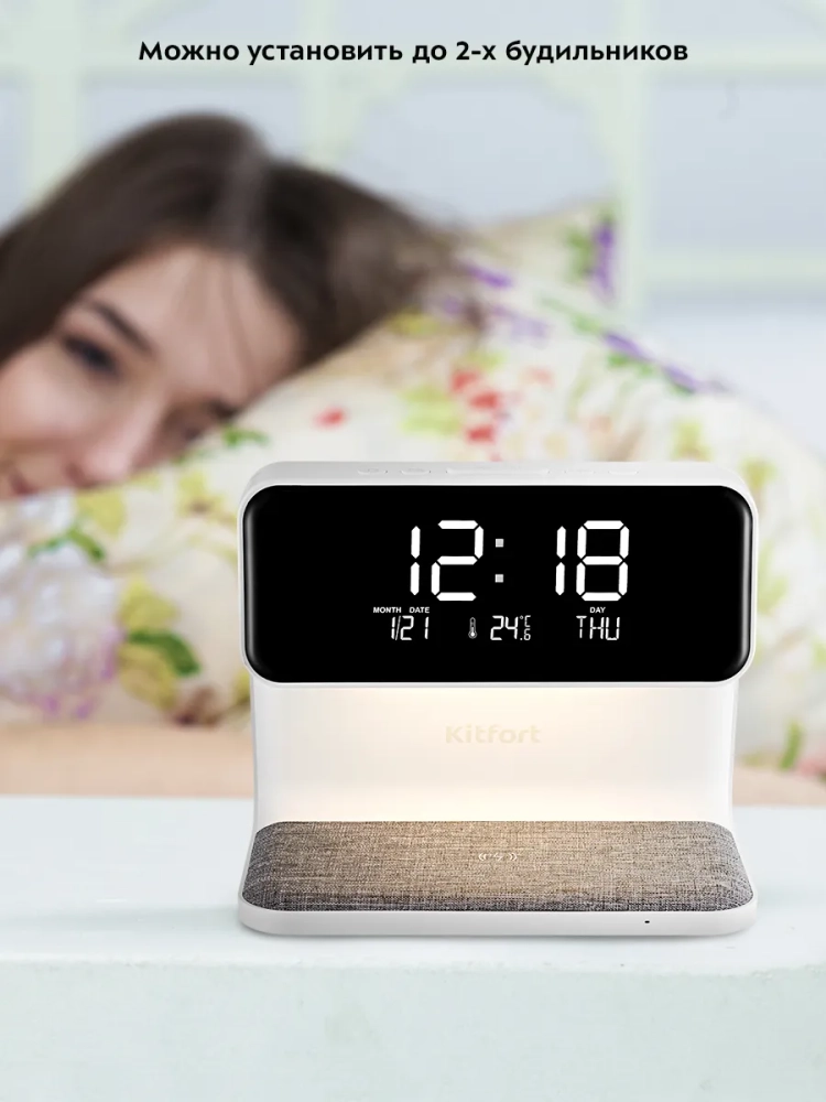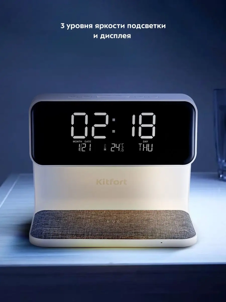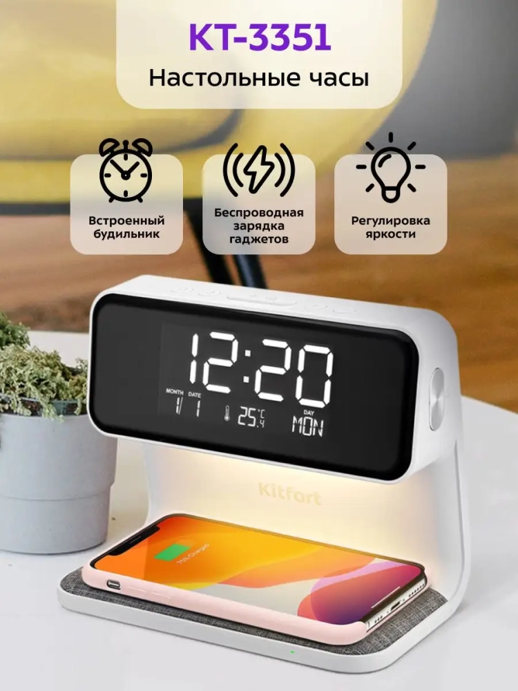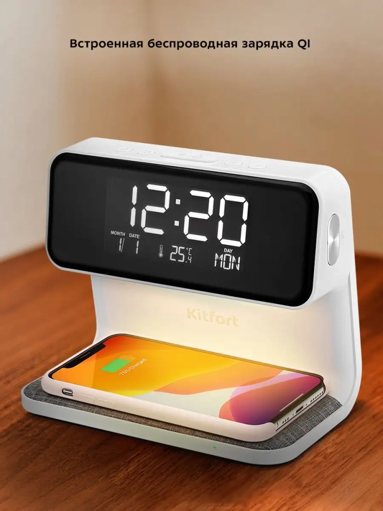 Настольные часы Kitfort KT-3351 выполняют сразу несколько функций: показывают время, дату, день недели и температуру, могут служить будильником и светильником. Благодаря беспроводной зарядке, встроенной в нижнюю часть корпуса, вы можете с легкостью заряжать телефон, часы или другие устройства, если они поддерживают функцию беспроводной зарядки. Яркость дисплея и подсветки настраивается, что очень удобно. Также подсветку и дисплей можно отключить. Благодаря стильному дизайну настольные часы легко впишутся в ваш интерьер.