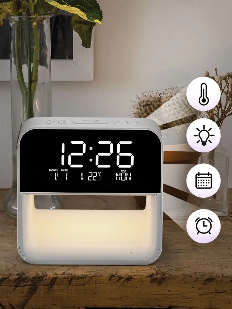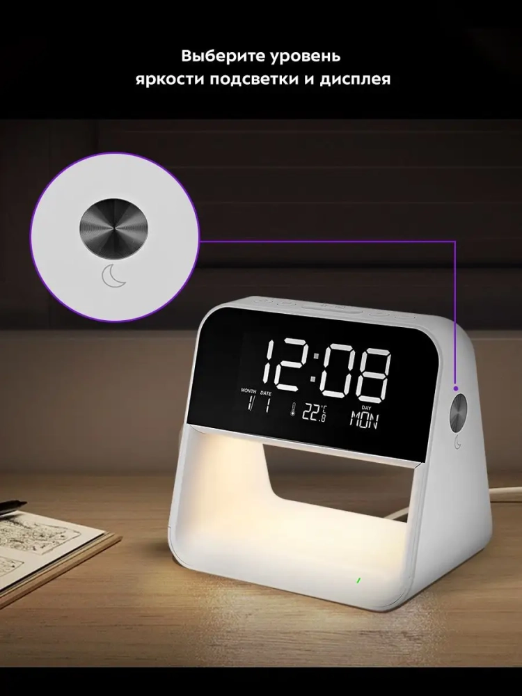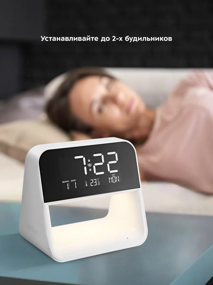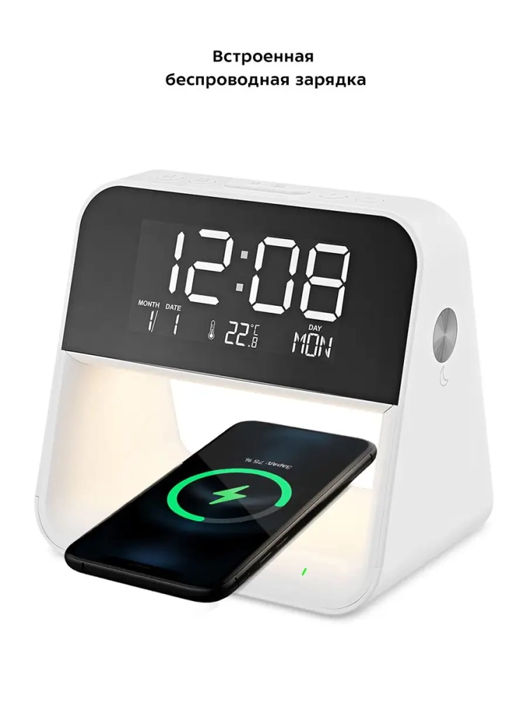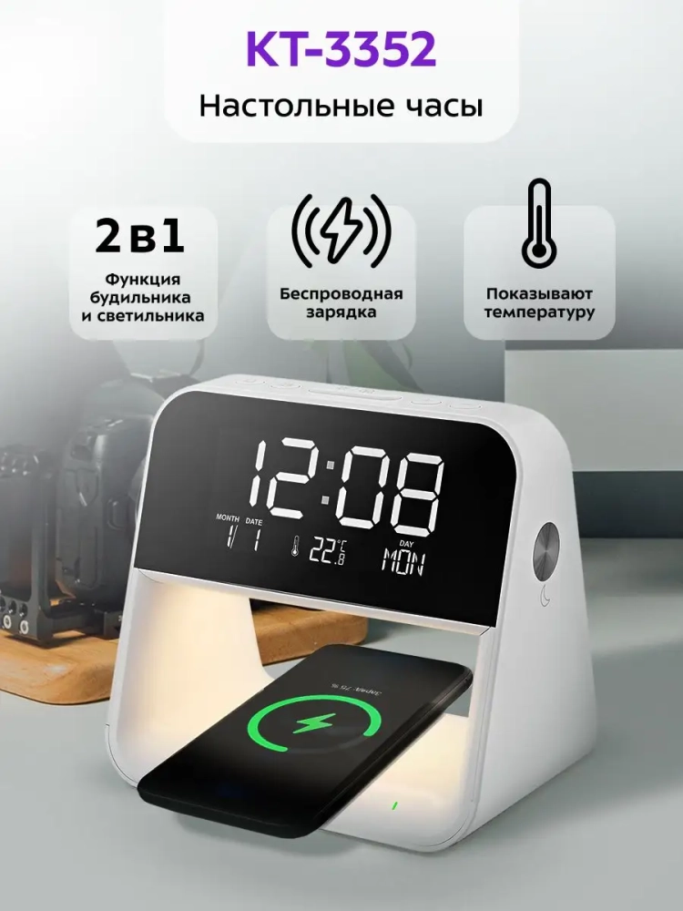Настольные часы Kitfort KT-3352 выполняют сразу несколько функций: показывают время, дату, день недели и температуру, могут служить будильником и светильником. Благодаря беспроводной зарядке, встроенной в нижнюю часть корпуса, вы можете с легкостью заряжать телефон, часы или другие устройства, если они поддерживают функцию беспроводной зарядки. Яркость дисплея и подсветки настраивается, что очень удобно. Также подсветку и дисплей можно отключить. Благодаря стильному дизайну настольные часы легко впишутся в ваш интерьер.