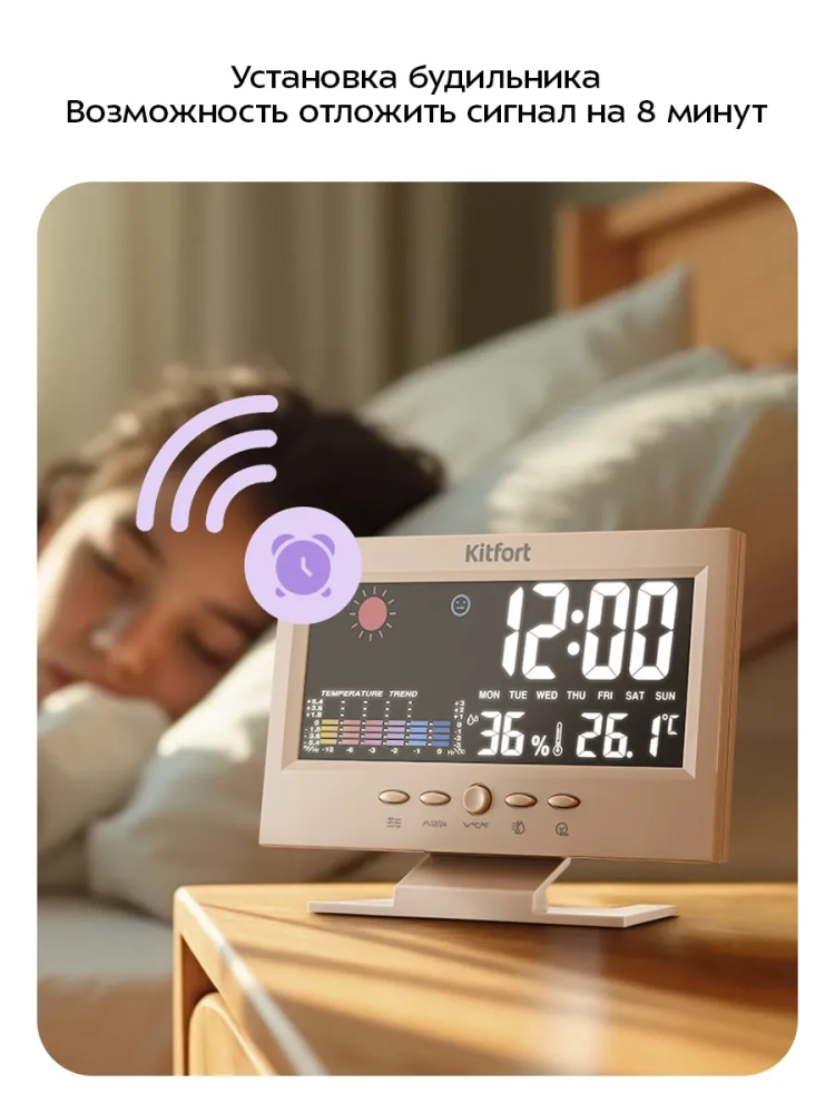 Эти настольные часы с термометром и гигрометром от Kitfort оснащены светодиодным циферблатом, который обеспечивает яркую подсветку в темноте. Электронные часы с крупными цифрами легко читаются даже в условиях низкой освещенности. Настольные часы также выполняют функцию будильника, что делает их многофункциональным устройством для спальни или гостиной.