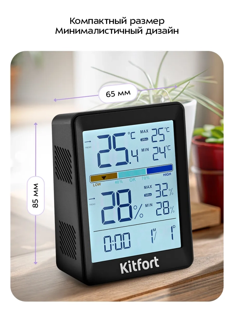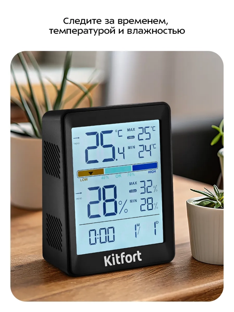 Часы с термометром и гигрометром показывают текущие температуру и влажность в помещении и их максимальные и минимальные значения за 24 часа или за все время работы устройства до извлечения батареек. Также на дисплее отображается тенденция изменения температуры и влажности за 1 час и индикатор влажности, отображающий качественную оценку текущей влажности воздуха (от низкого до высокого уровня). Комфортный микроклимат в помещении очень важен для человека, так как влияет на общее самочувствие, настроение и работоспособность.